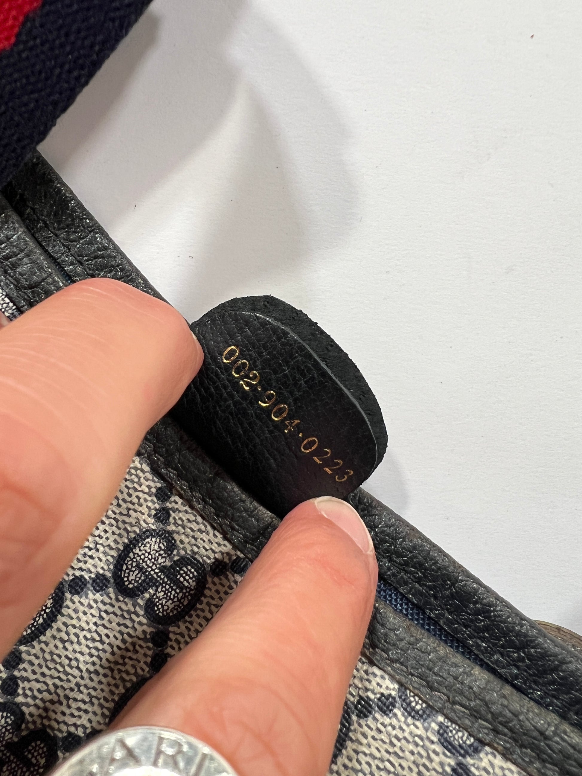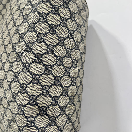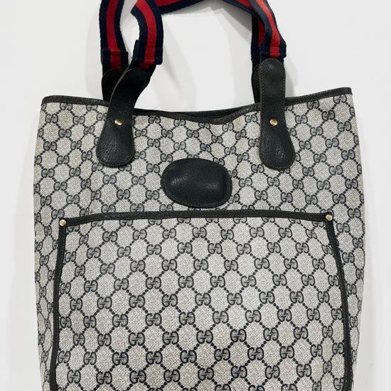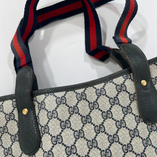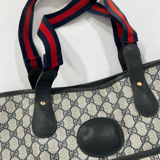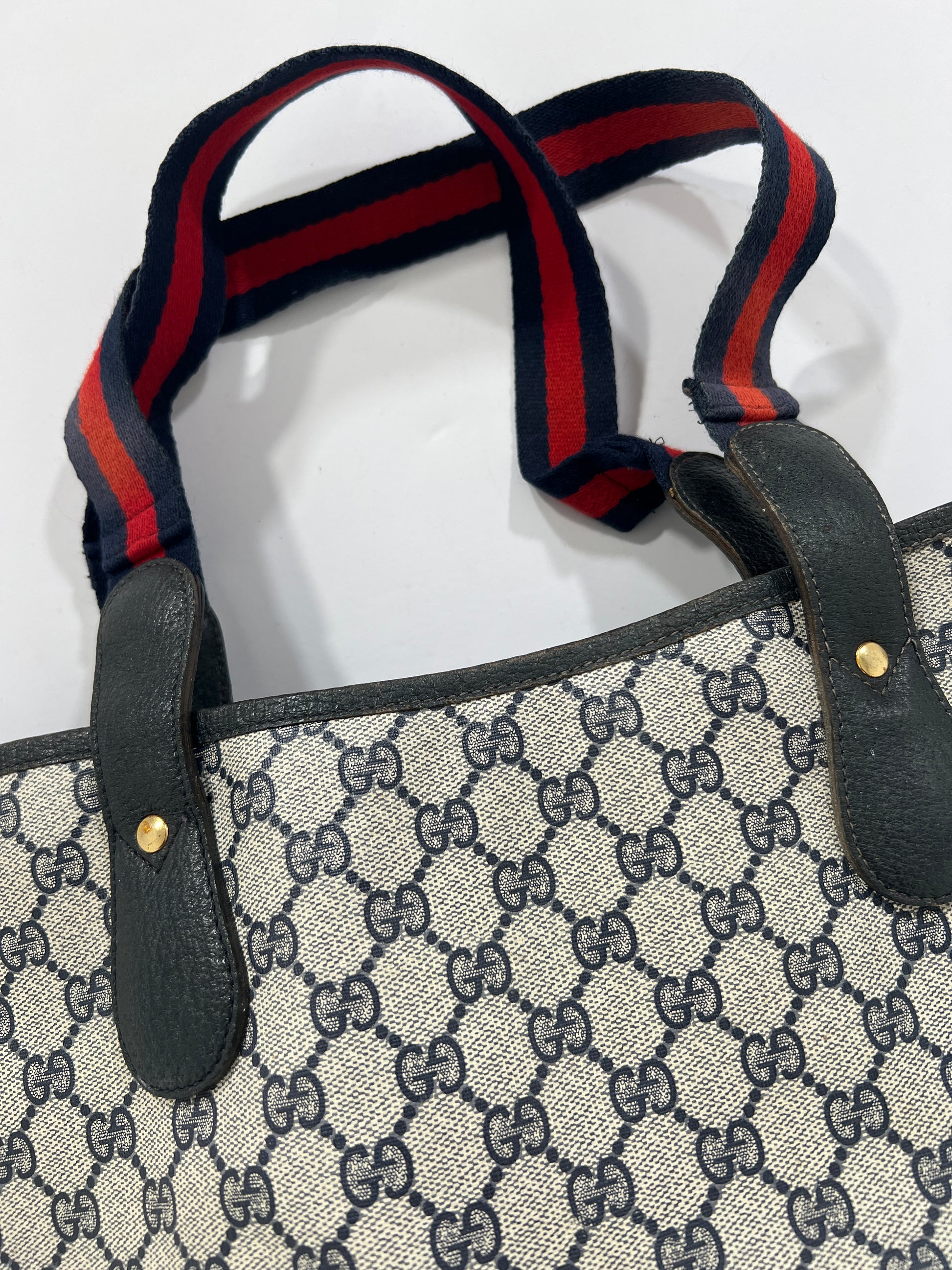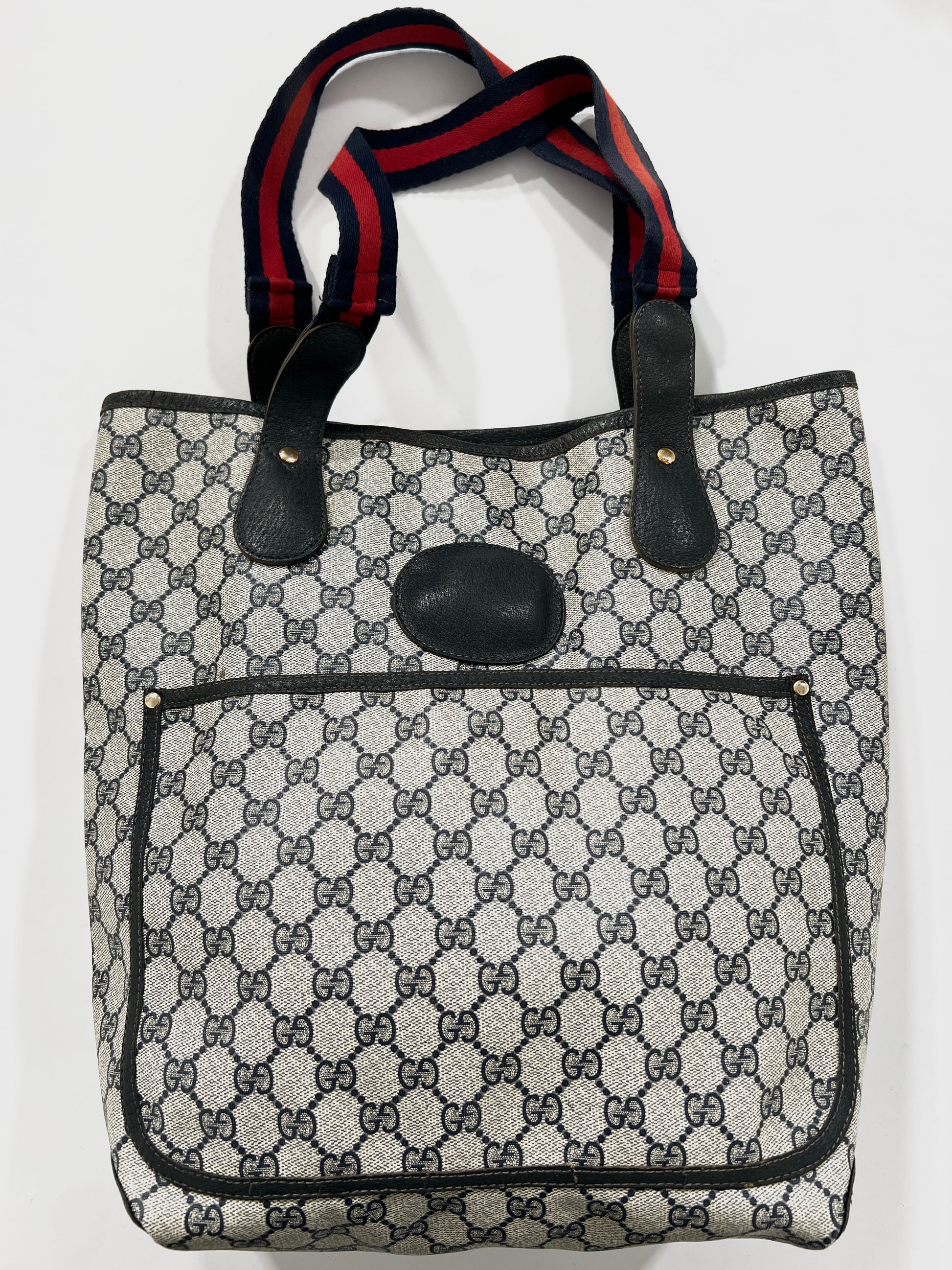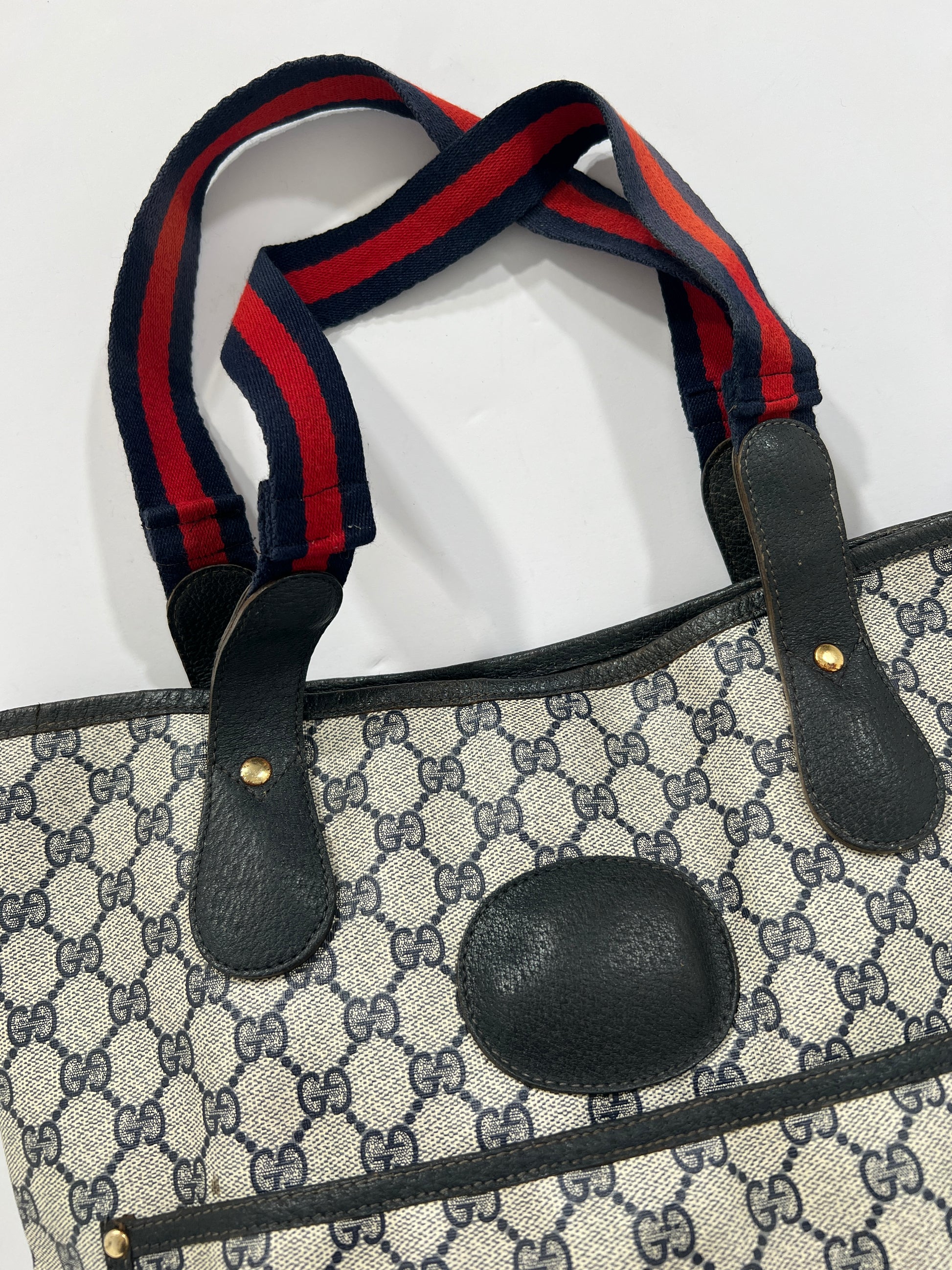Borsa Gucci vintage monogram in pelle con manici in tessuto blu e rossi. Tasca esterna chiusura clip. Esterno intatto seminuovo! Interno non visibile da rinfrescare. Borsa comoda, capiente e bella.