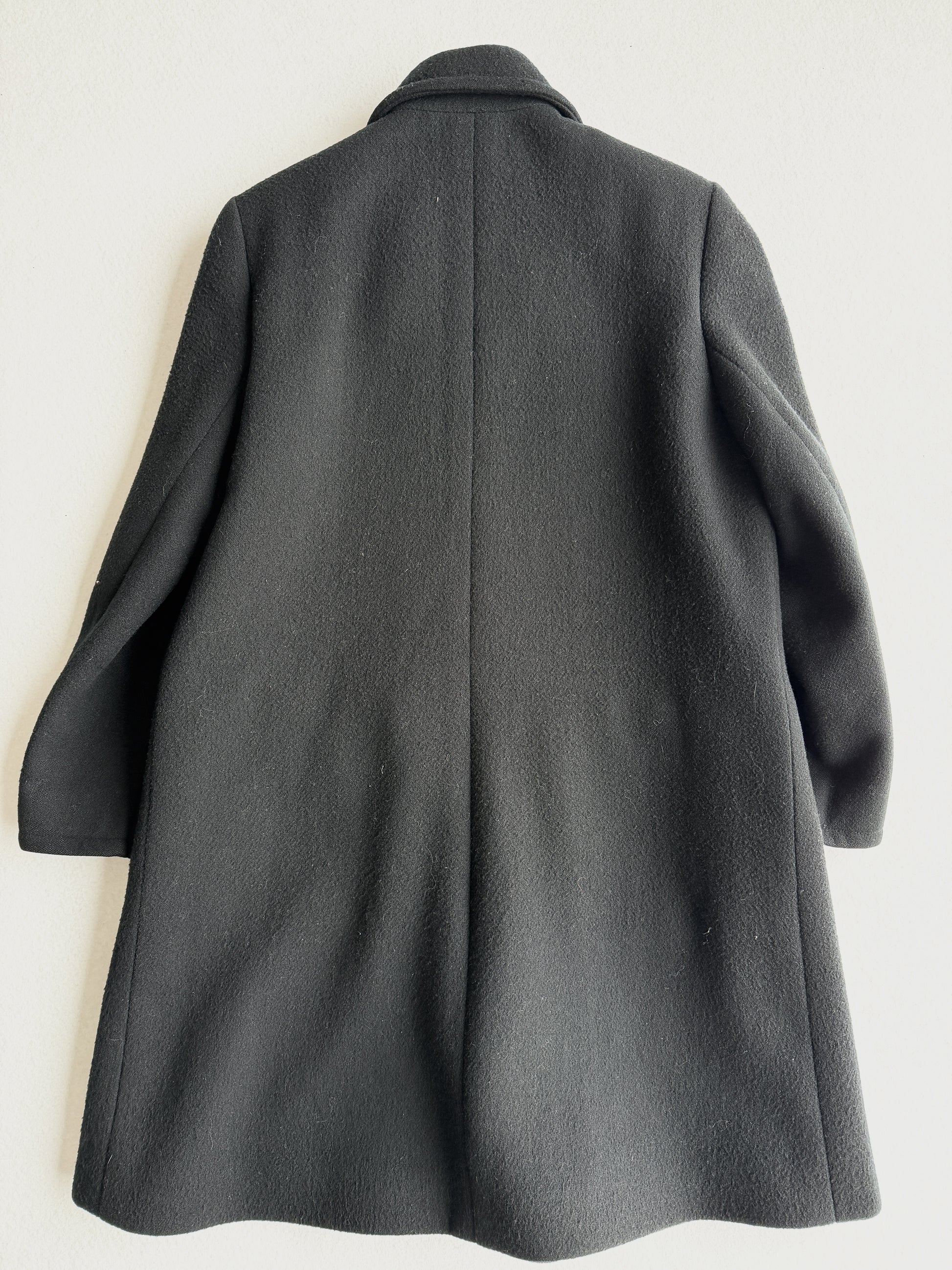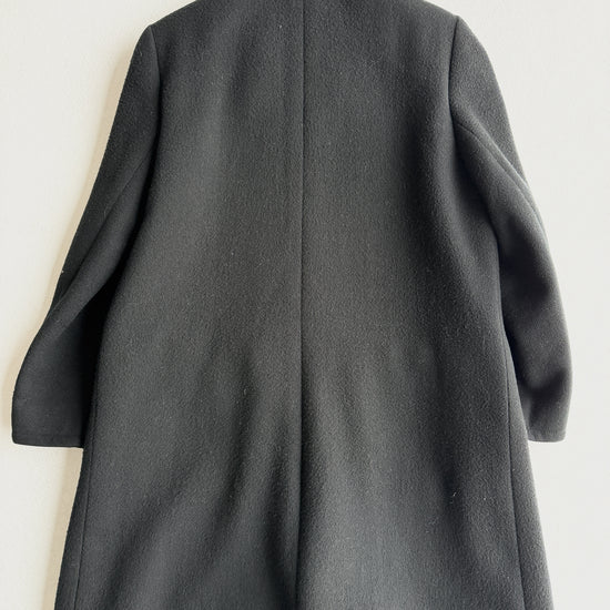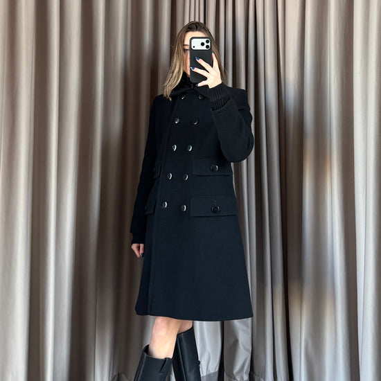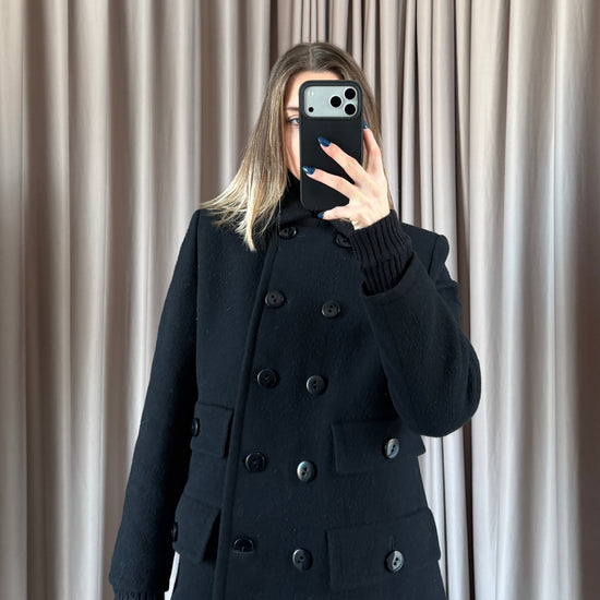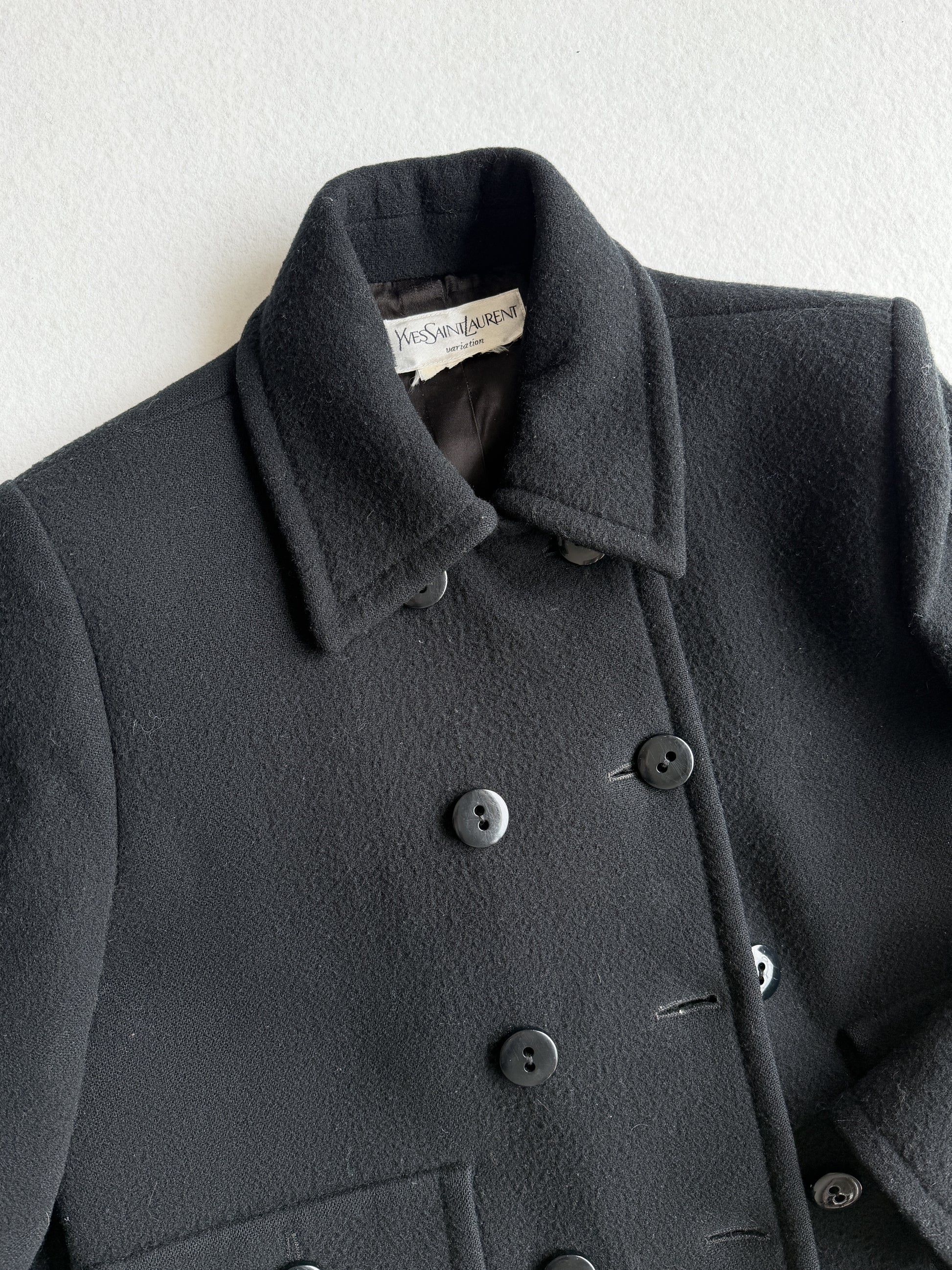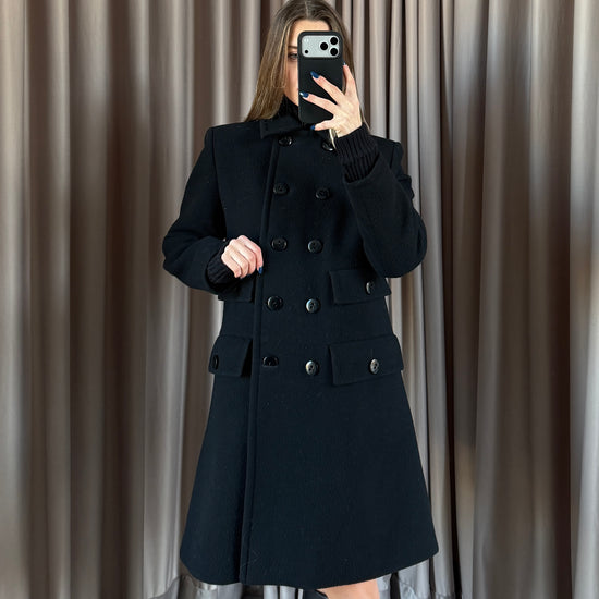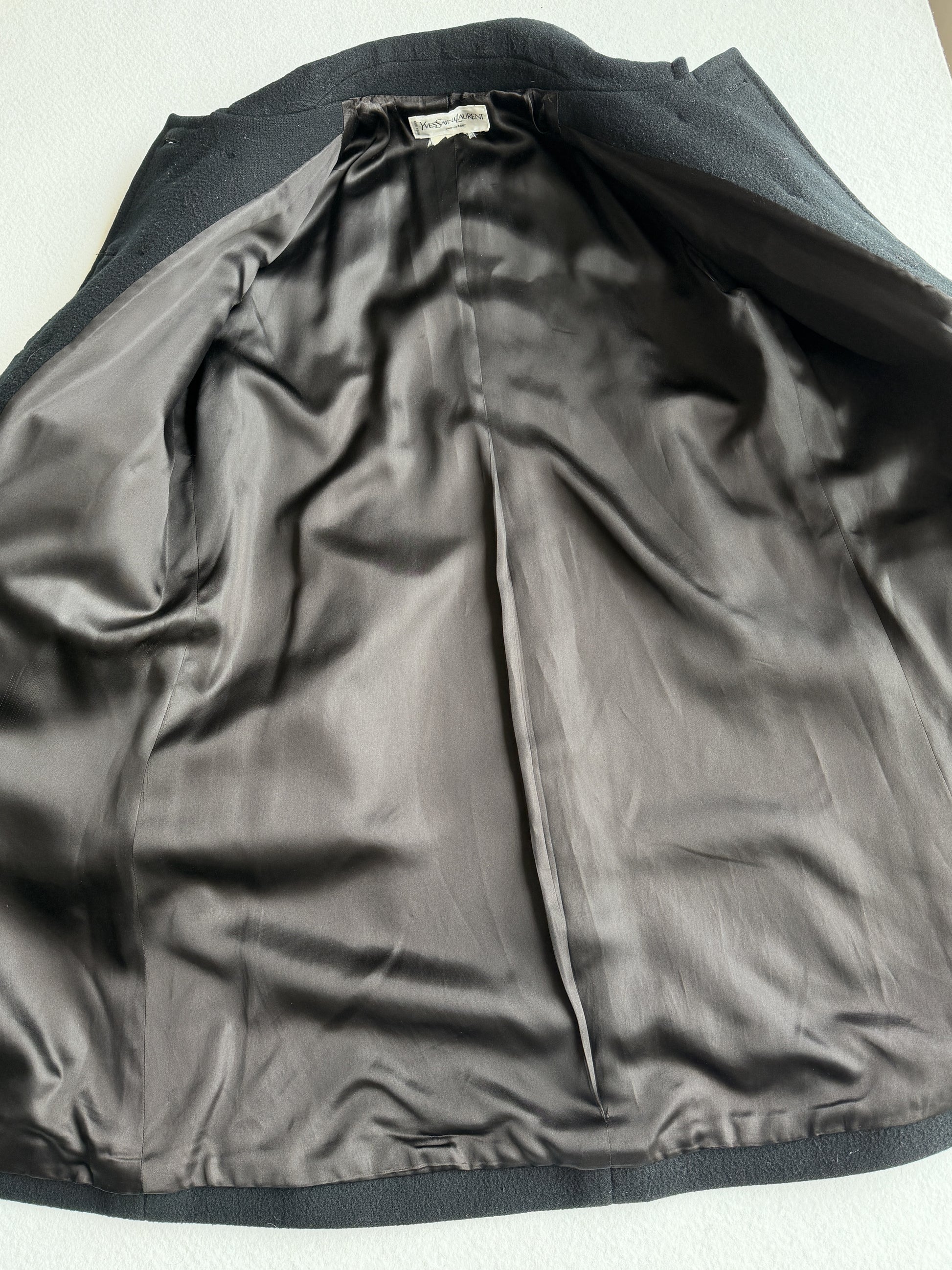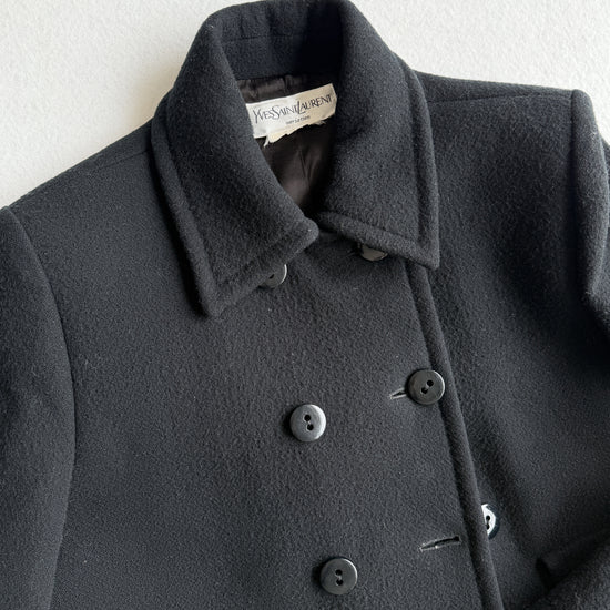 Cappotto vintage Yves Saint Laurent nero in lana doppiopetto, bottoni neri. Taglio unico e raro. Quattro tasche. Tessuto ottime condizione qualche zona evidenziata.
