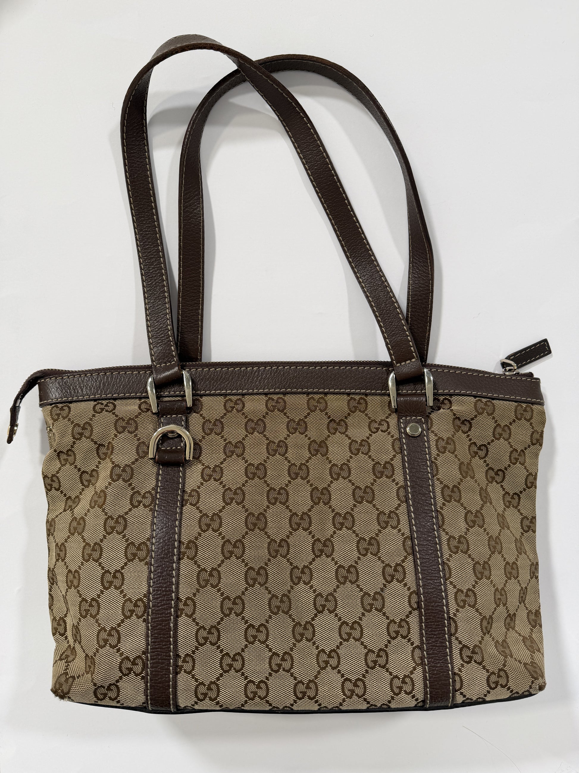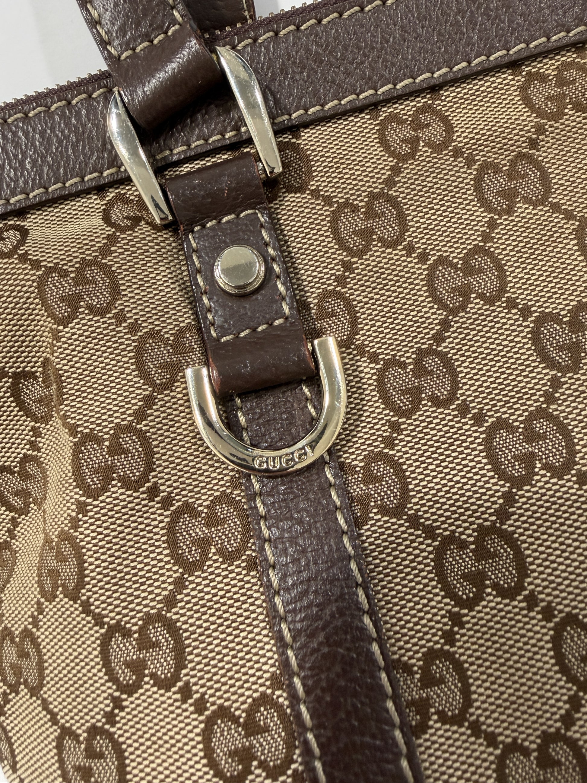 Borsa Gucci monogram Abbey, fibbie logate, tela, interno con taschino. Monogram intatto. Interno ottimo. Vedi spigoli.