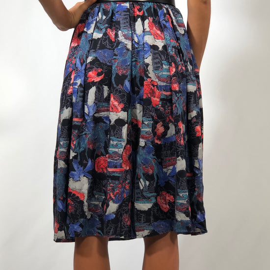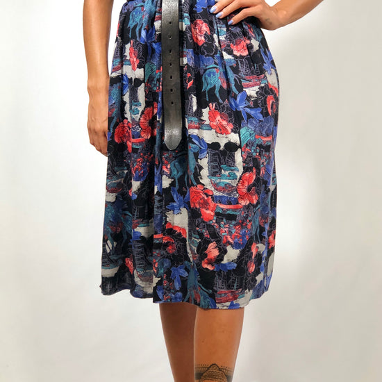 Deliziosa gonna vintage anni '80, fantasia floreale sulle tonalità di nero e blu, con zip laterale e passanti in vita.