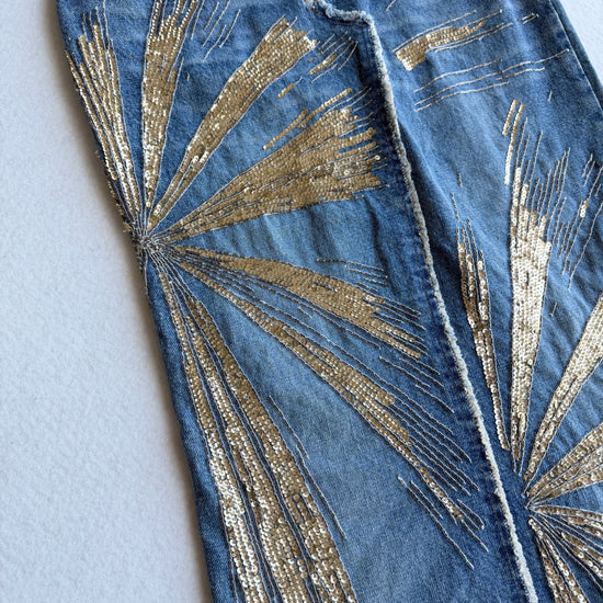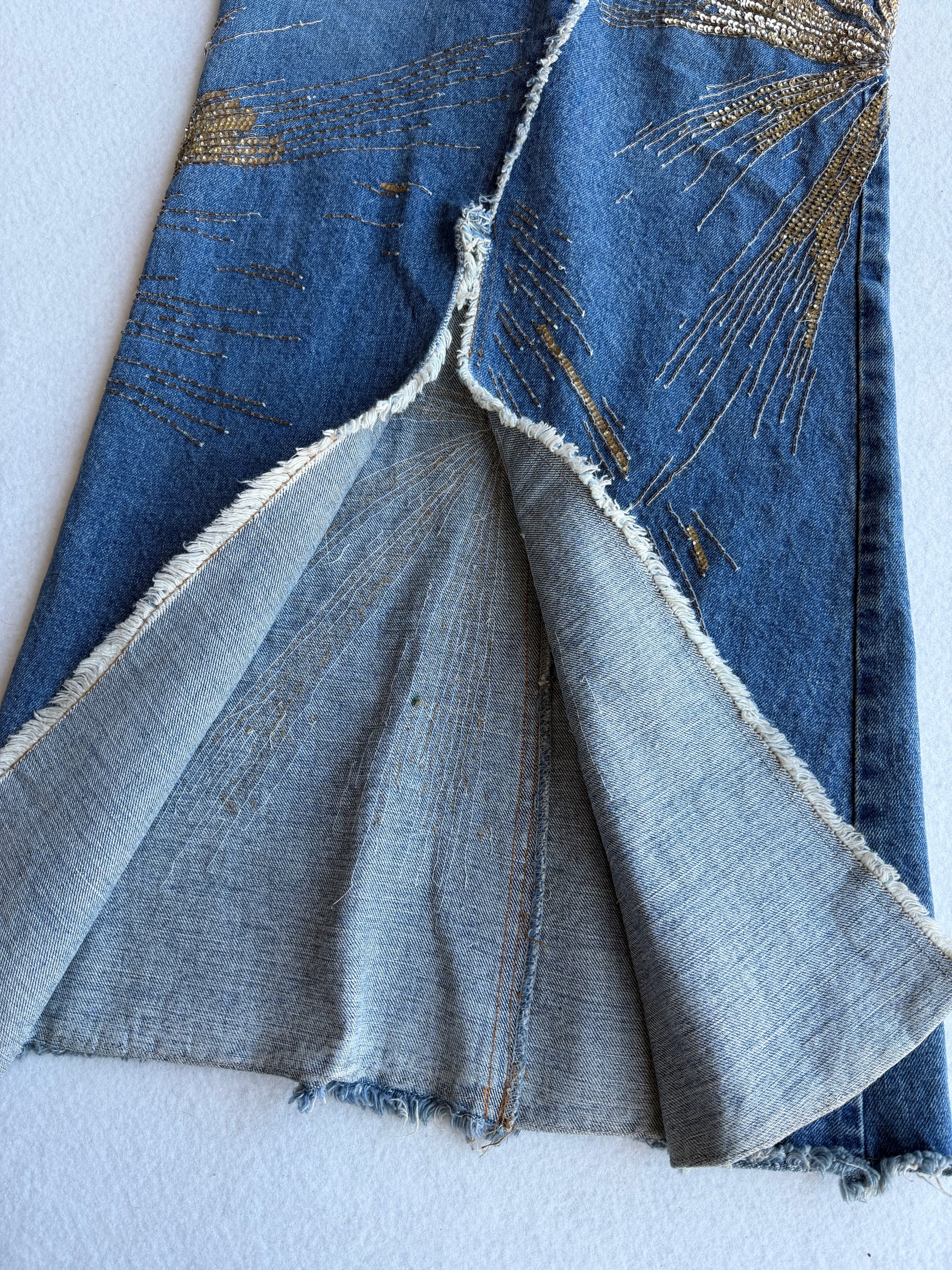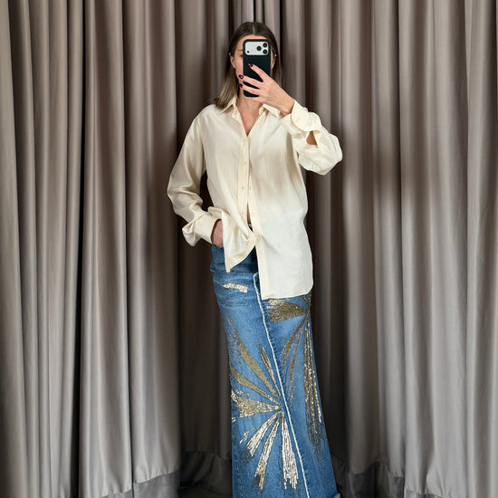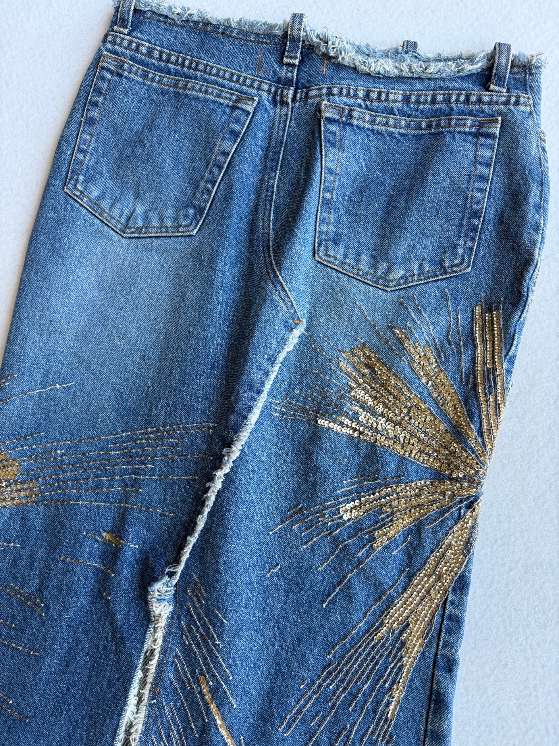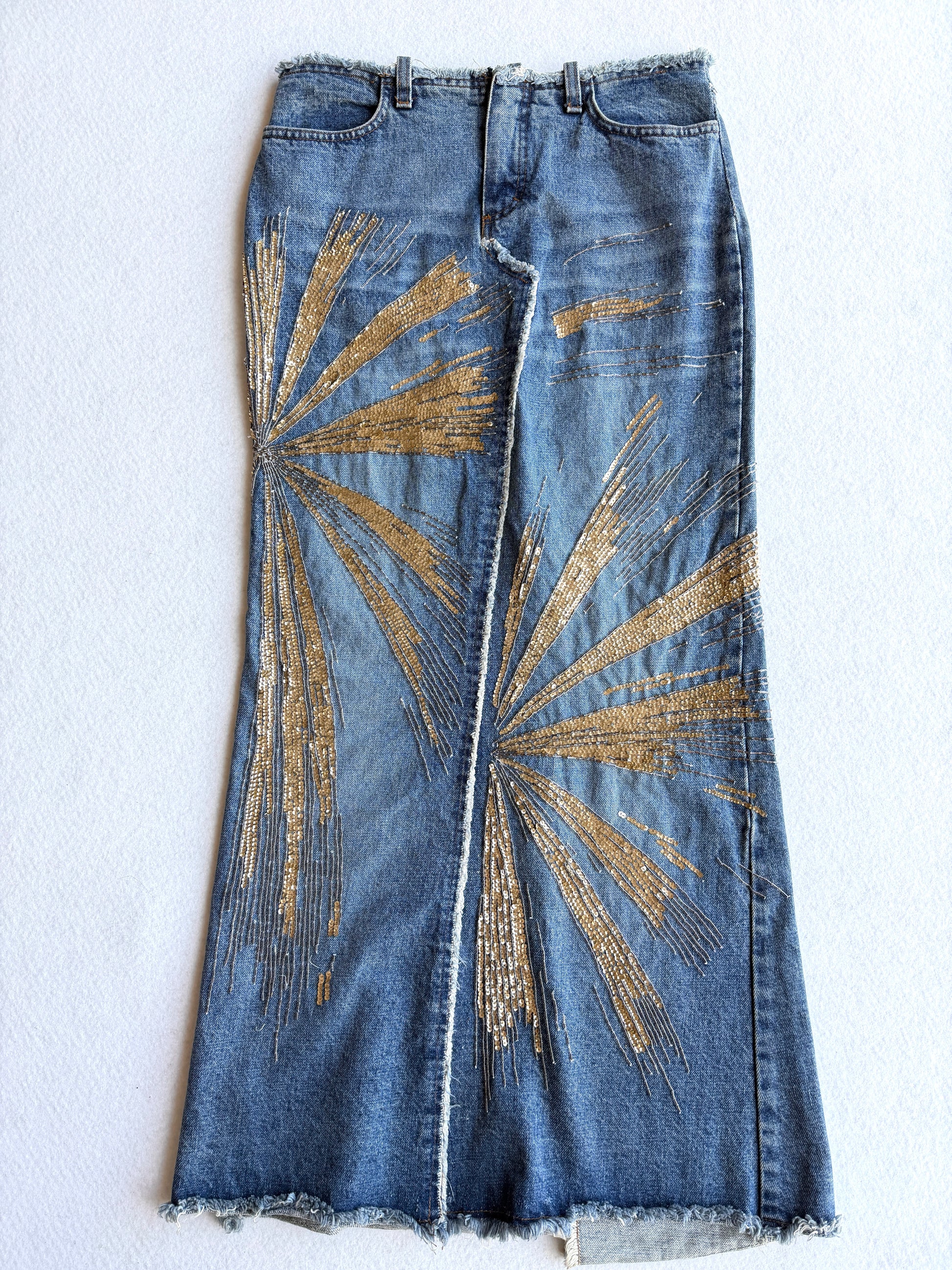 Gonna lunga in denim con dettagli dorati sulla passerella di Roberto Cavalli per la P/E 2001 Questa straordinaria gonna in denim della collezione primavera/estate 2001 di Roberto Cavalli cattura lo spirito opulento del marchio. Tagliato in una silhouette lunga e dritta con orlo grezzo, il capo è ornato da audaci paillettes oro e bronzo che si irradiano sul davanti. Una gonna drammatica e glamour che esemplifica l'energia massimalista di Cavalli e il suo stile da passerella.