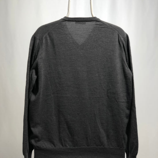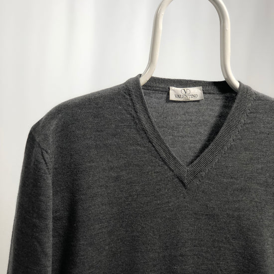 Maglia Valentino vintage in lana merino, taglia L, manica lunga, di colore grigio con collo a V e logo ricamato, morbida ed elegante.