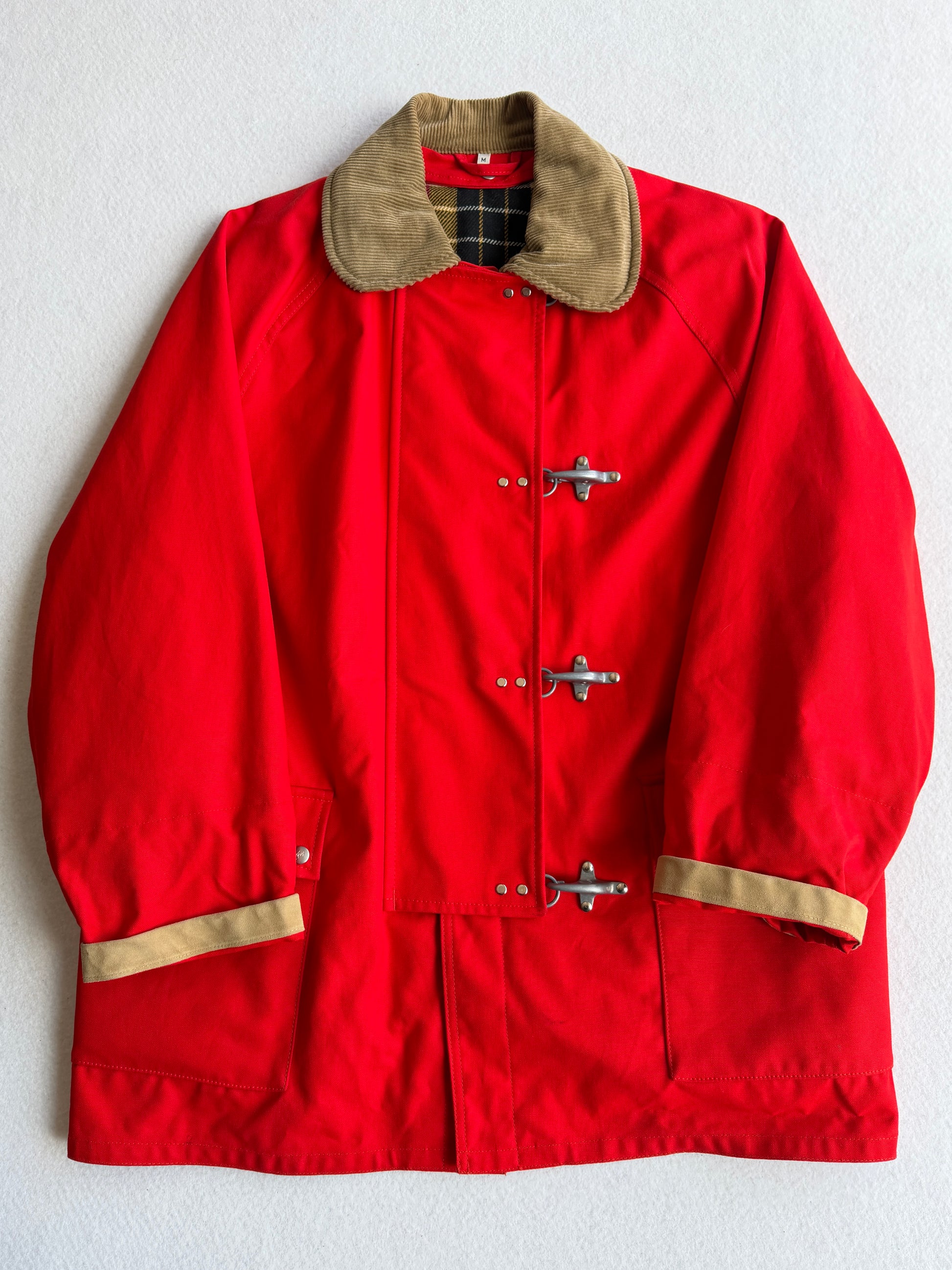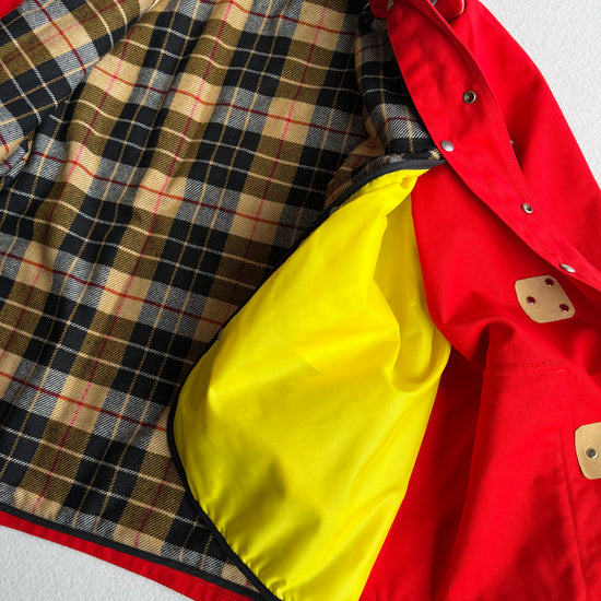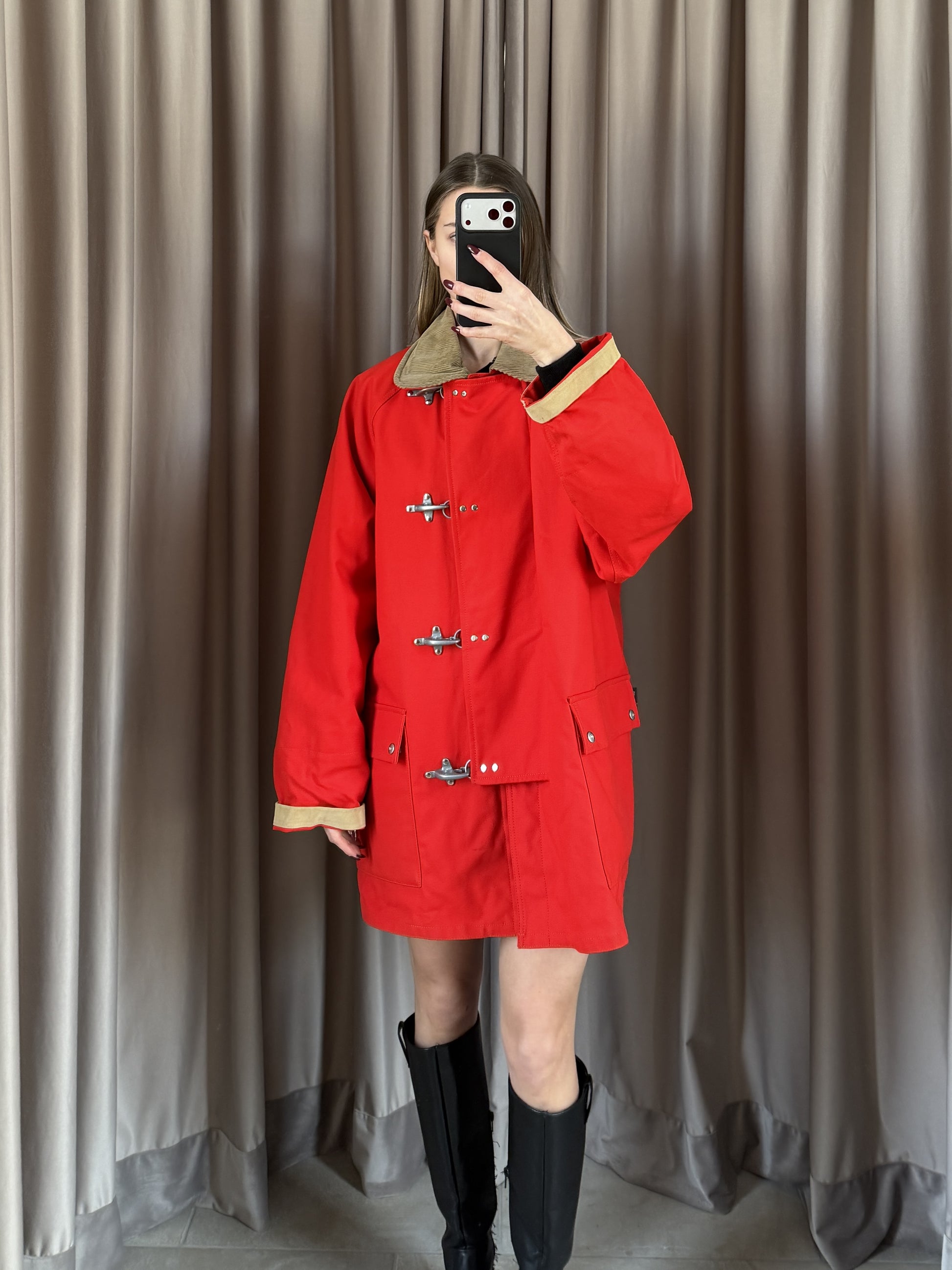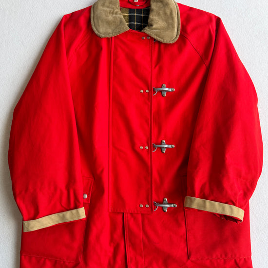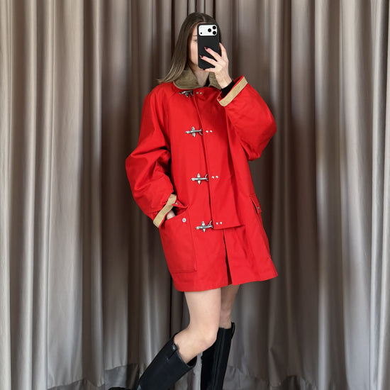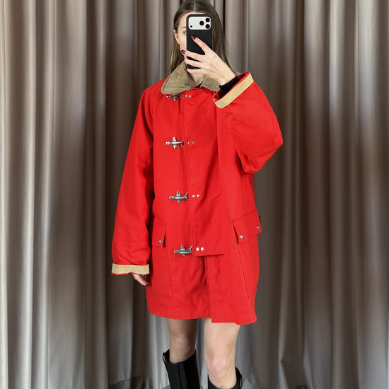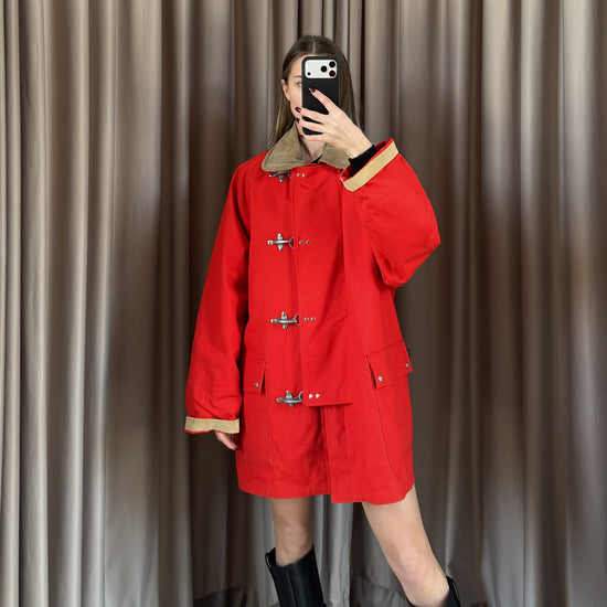 Cappotto vintage Fay in cotone rosso, taglia M, con design classico e funzionale. Caratterizzato da 4 ganci e bottoni per una chiusura sicura. Doppio tascone con interno fantasia. Versatile e unisex. In condizioni ottimali, seminuovo, pronto a diventare un pezzo iconico del tuo guardaroba vintage.