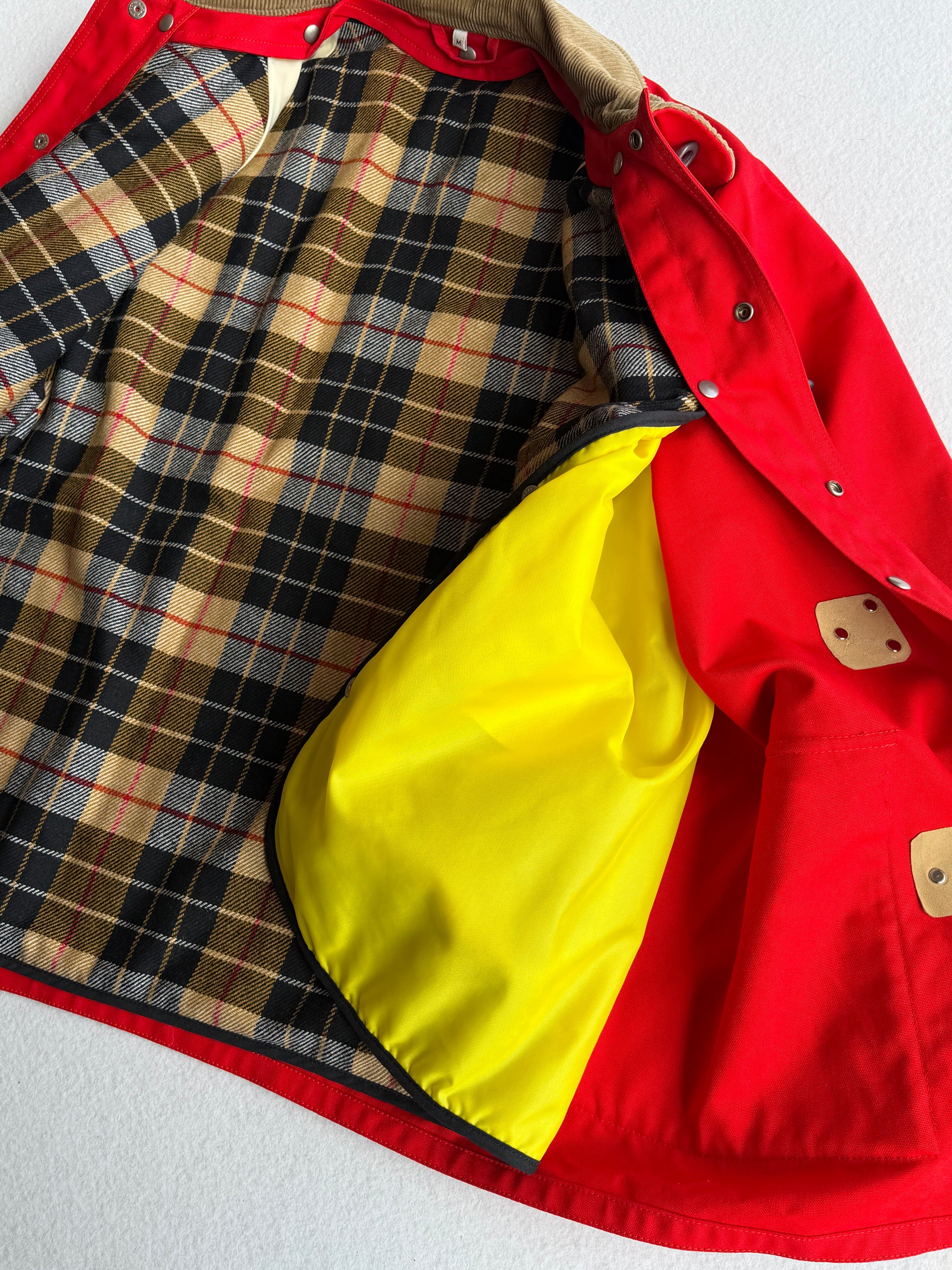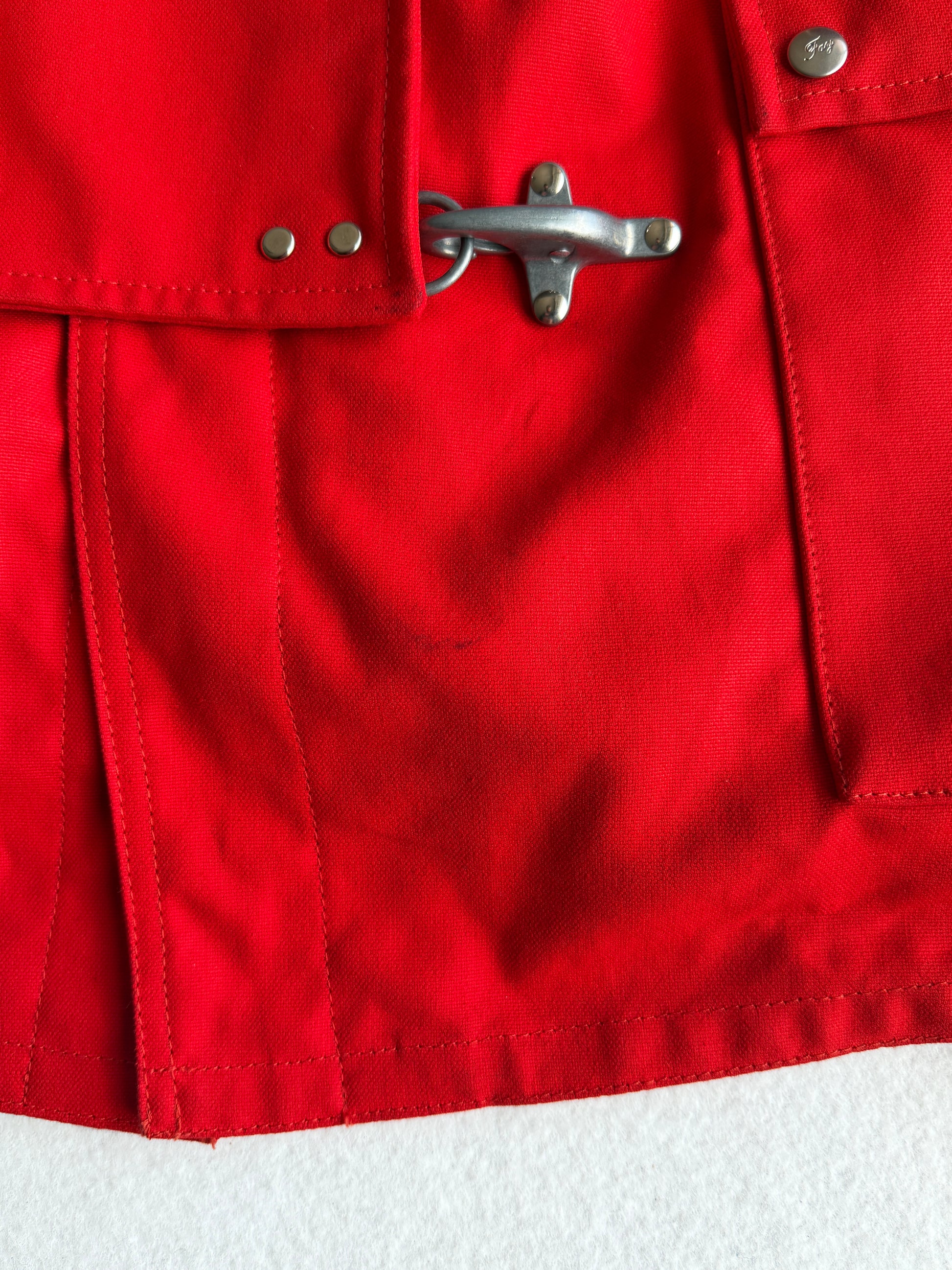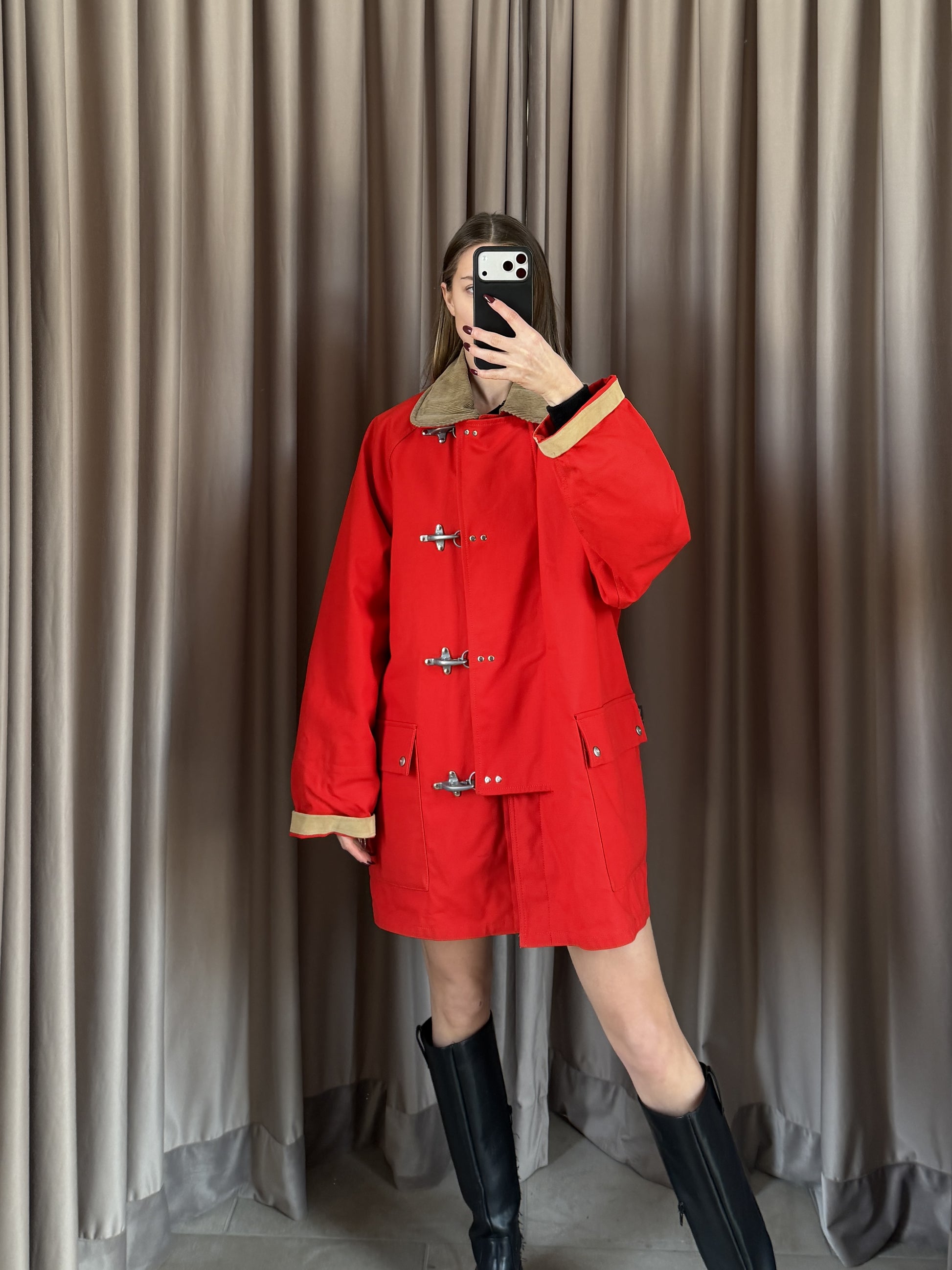 Cappotto vintage Fay in cotone rosso, taglia M, con design classico e funzionale. Caratterizzato da 4 ganci e bottoni per una chiusura sicura. Doppio tascone con interno fantasia. Versatile e unisex. In condizioni ottimali, seminuovo, pronto a diventare un pezzo iconico del tuo guardaroba vintage.