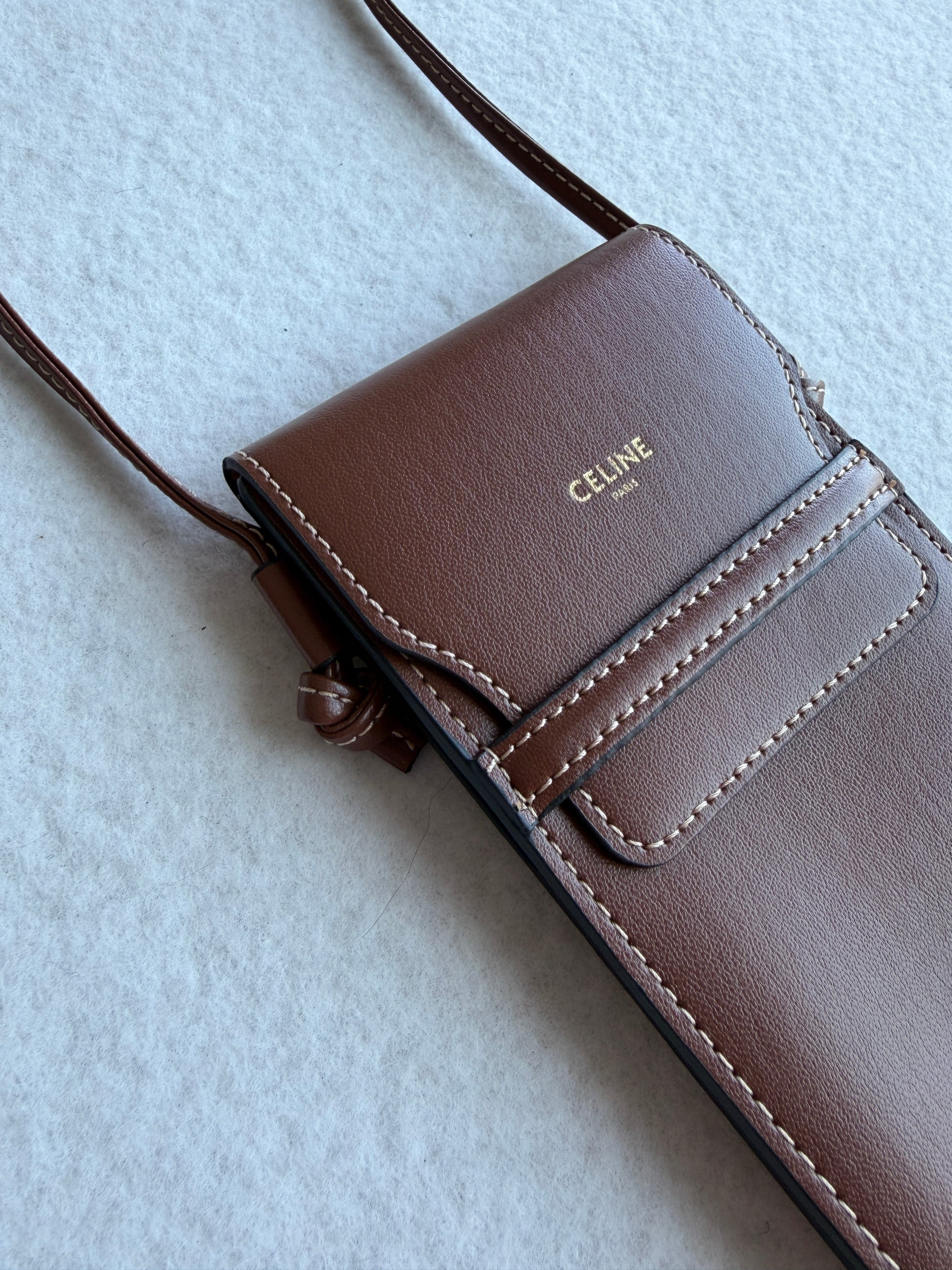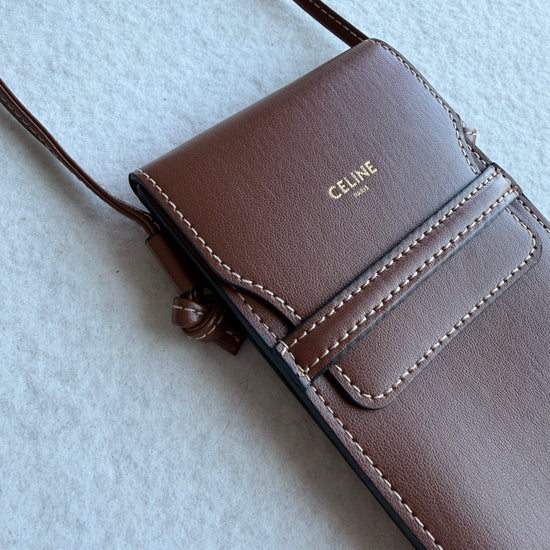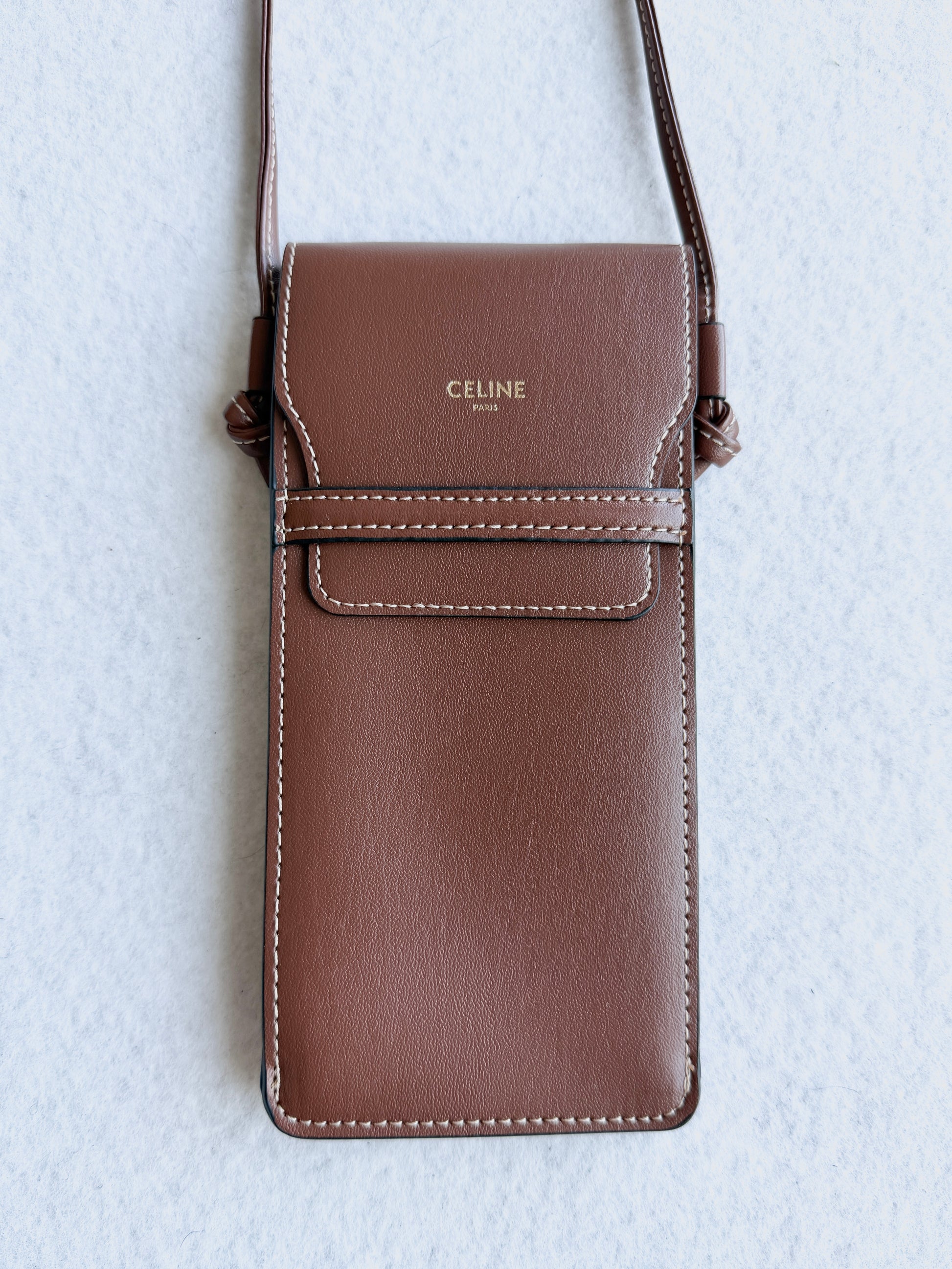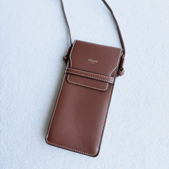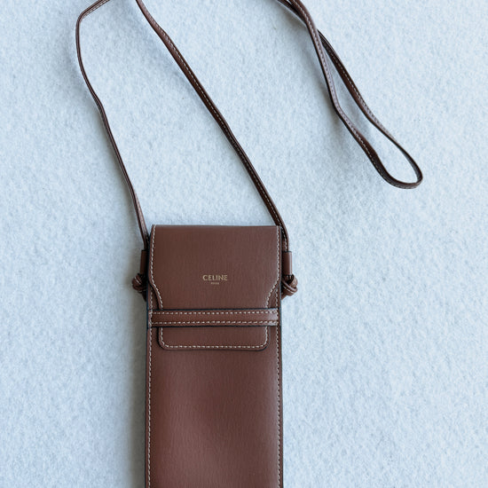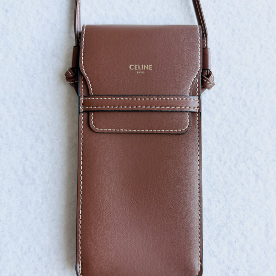 Porta occhiali Celine con tracolla color cuoio con logo oro sul davanti. Nuovo, mai utilizzato, come in foto.