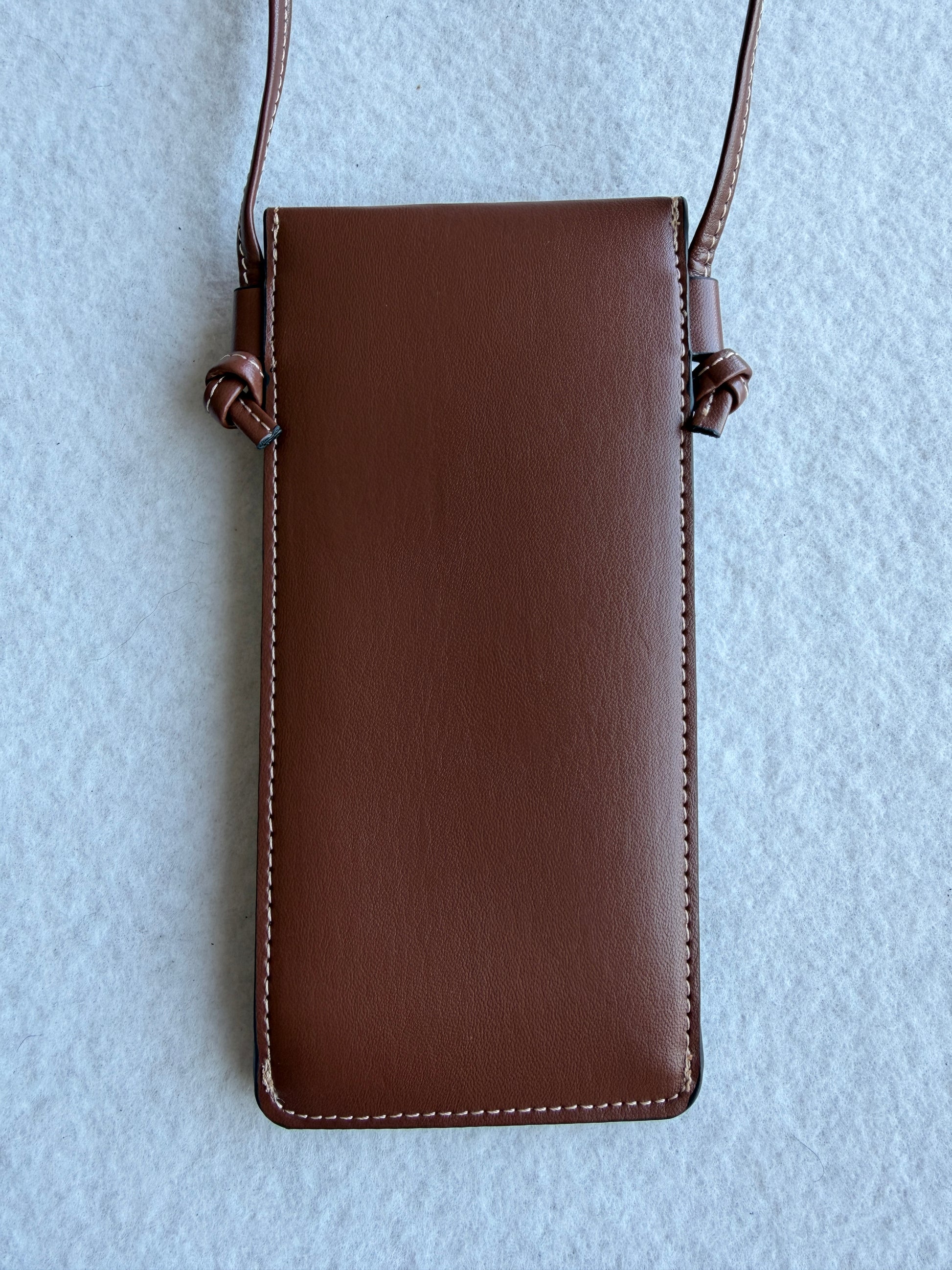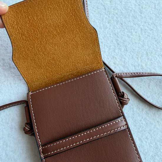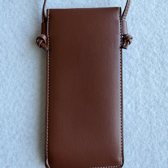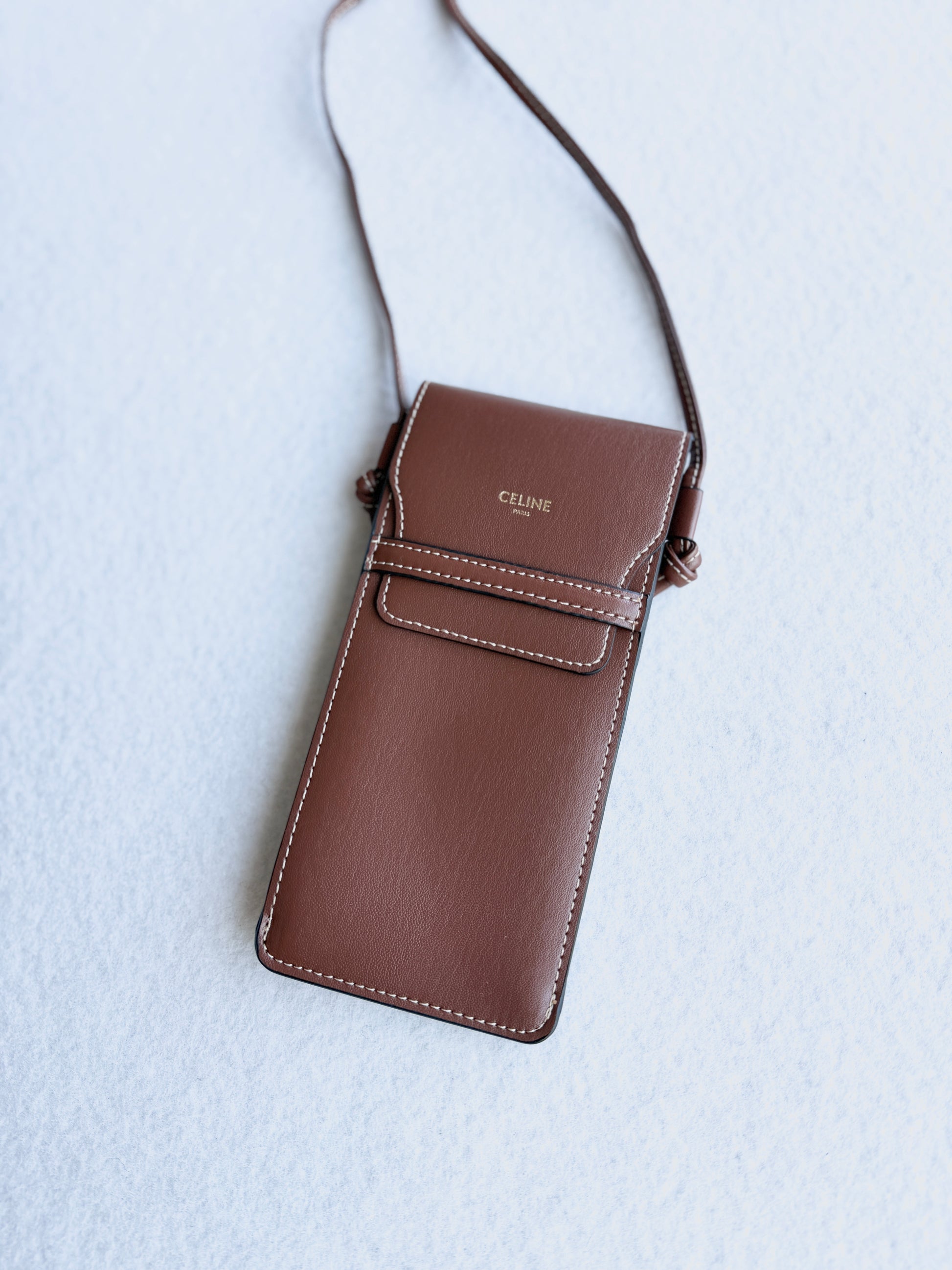Porta occhiali Celine con tracolla color cuoio con logo oro sul davanti. Nuovo, mai utilizzato, come in foto.