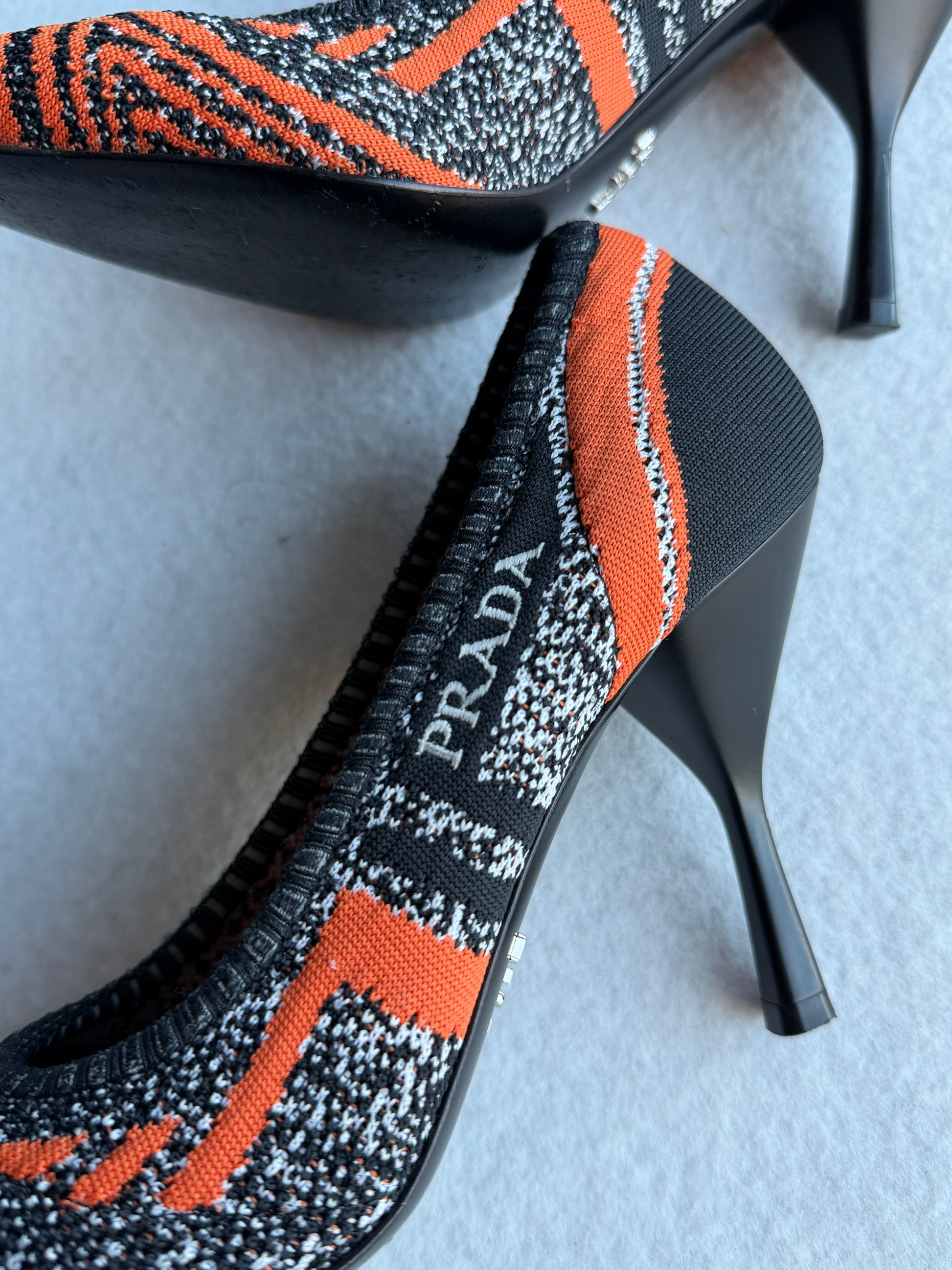 Scarpe perfettamente intatte avanti e dentro, leggera usura sotto, tacchi rinseriti nuovi. Logo laterale, colore nero e arancio con bianco.
