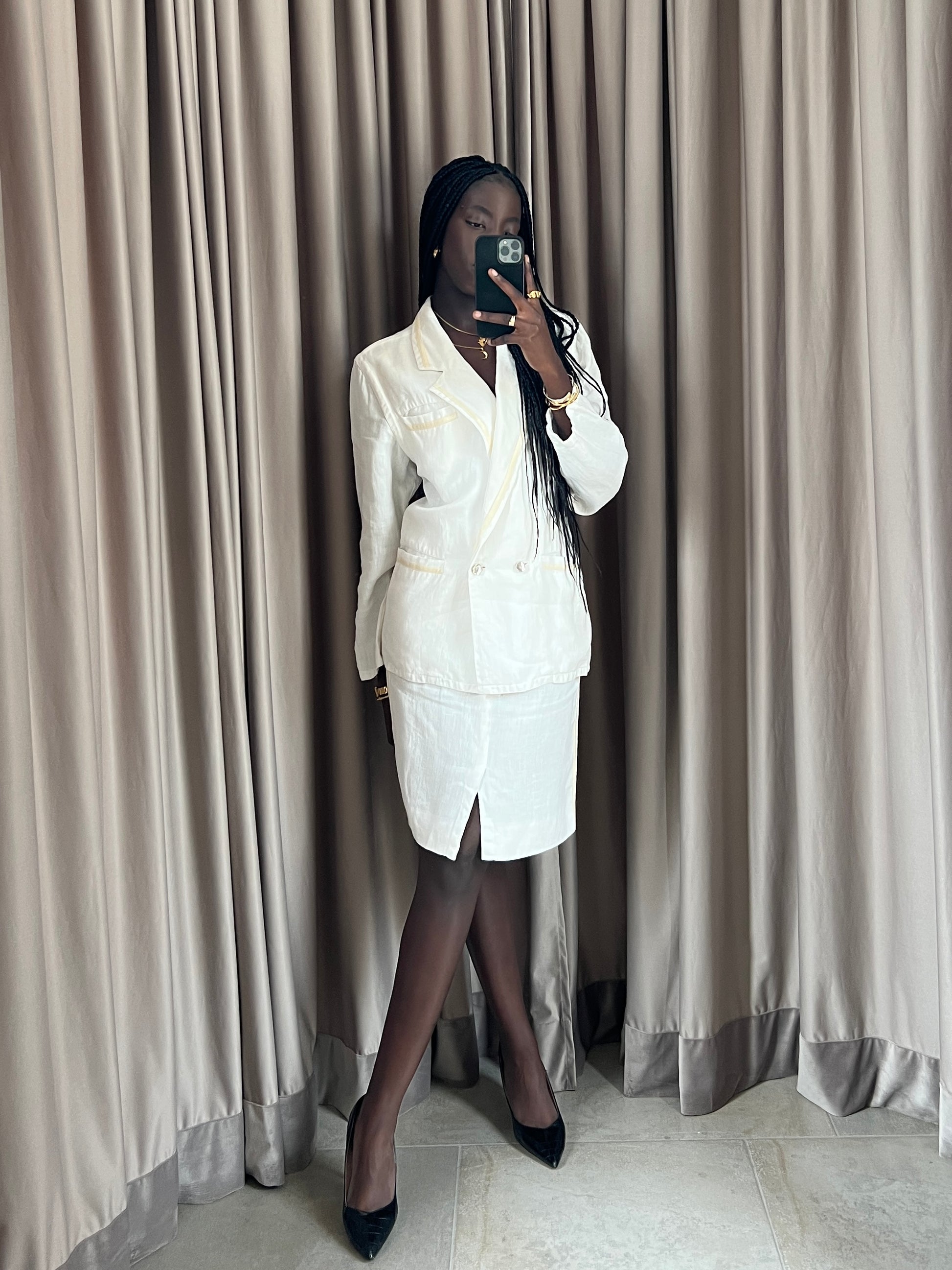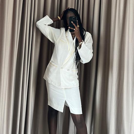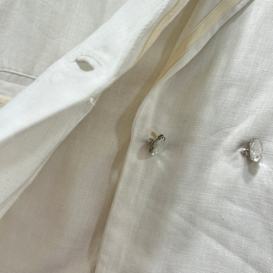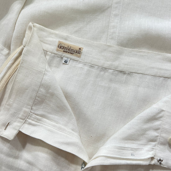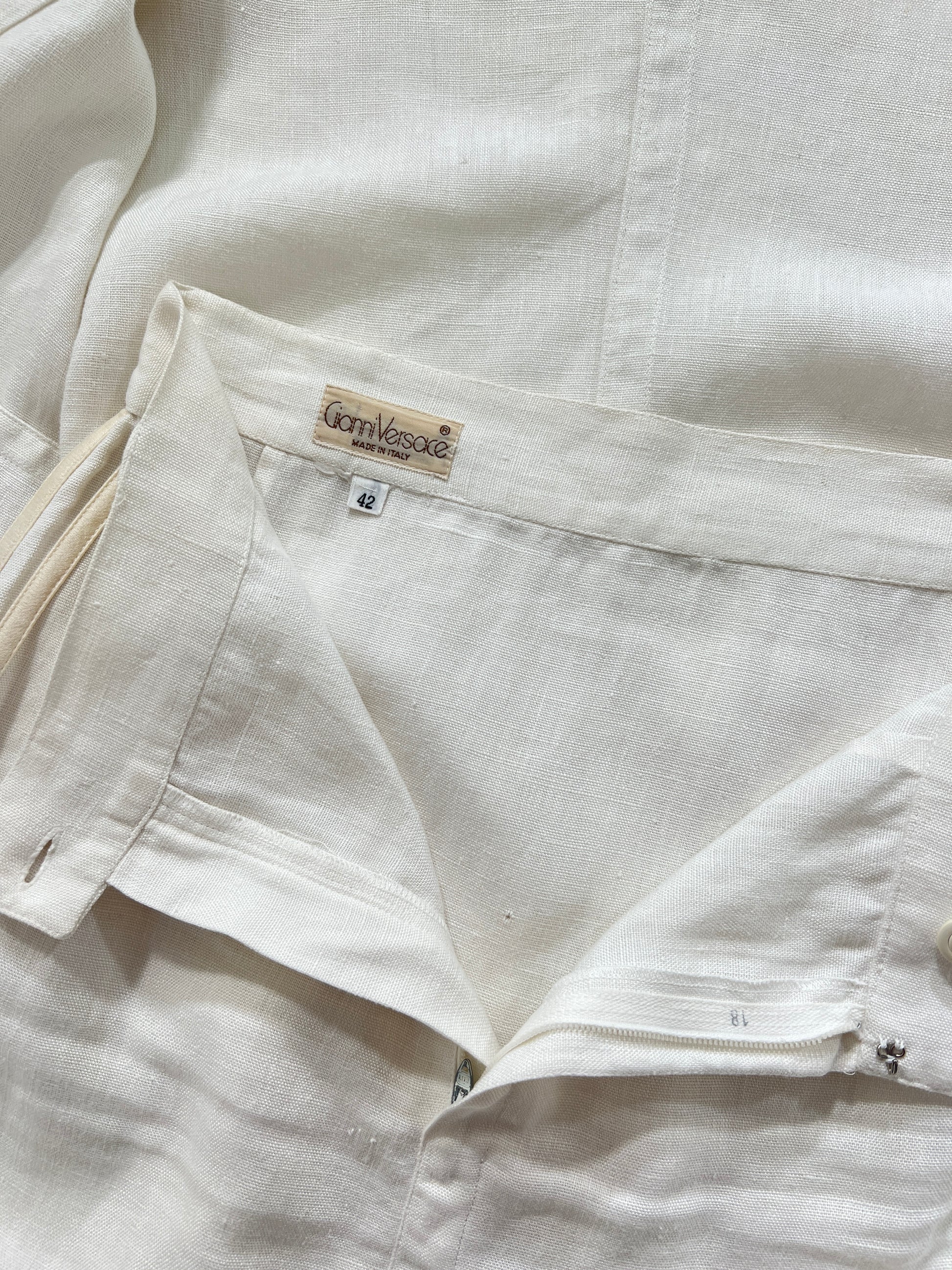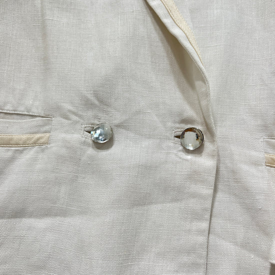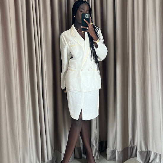 Completo vintage Versace in lino bianco, giacca e gonna, con inserti oro, doppia tasca e bottoni diamante. Ascelle intatte! Fresco, delicato e raro.