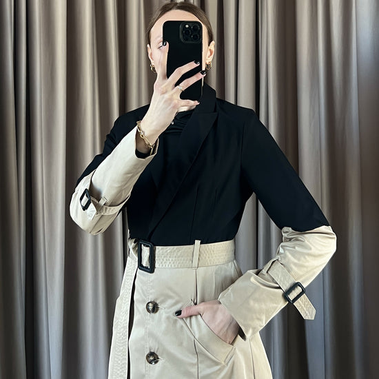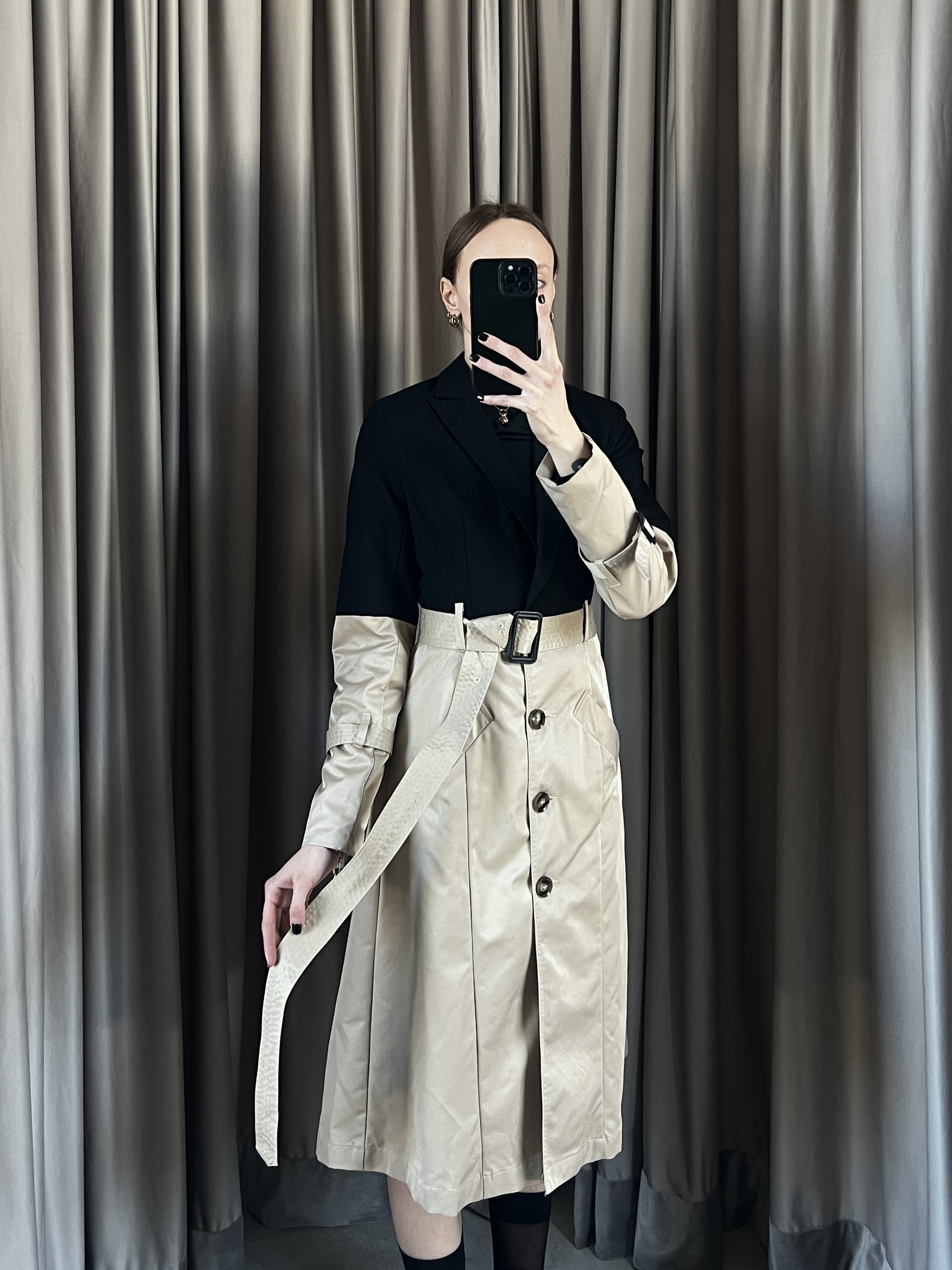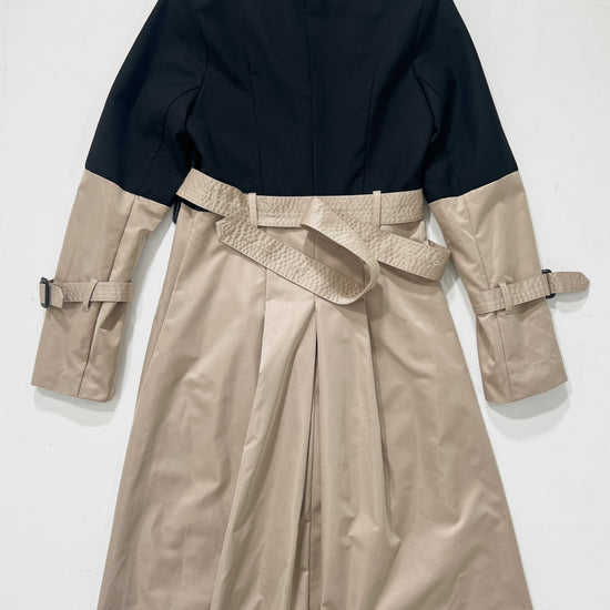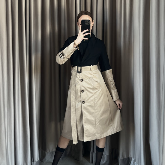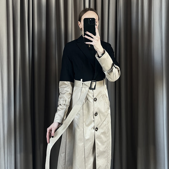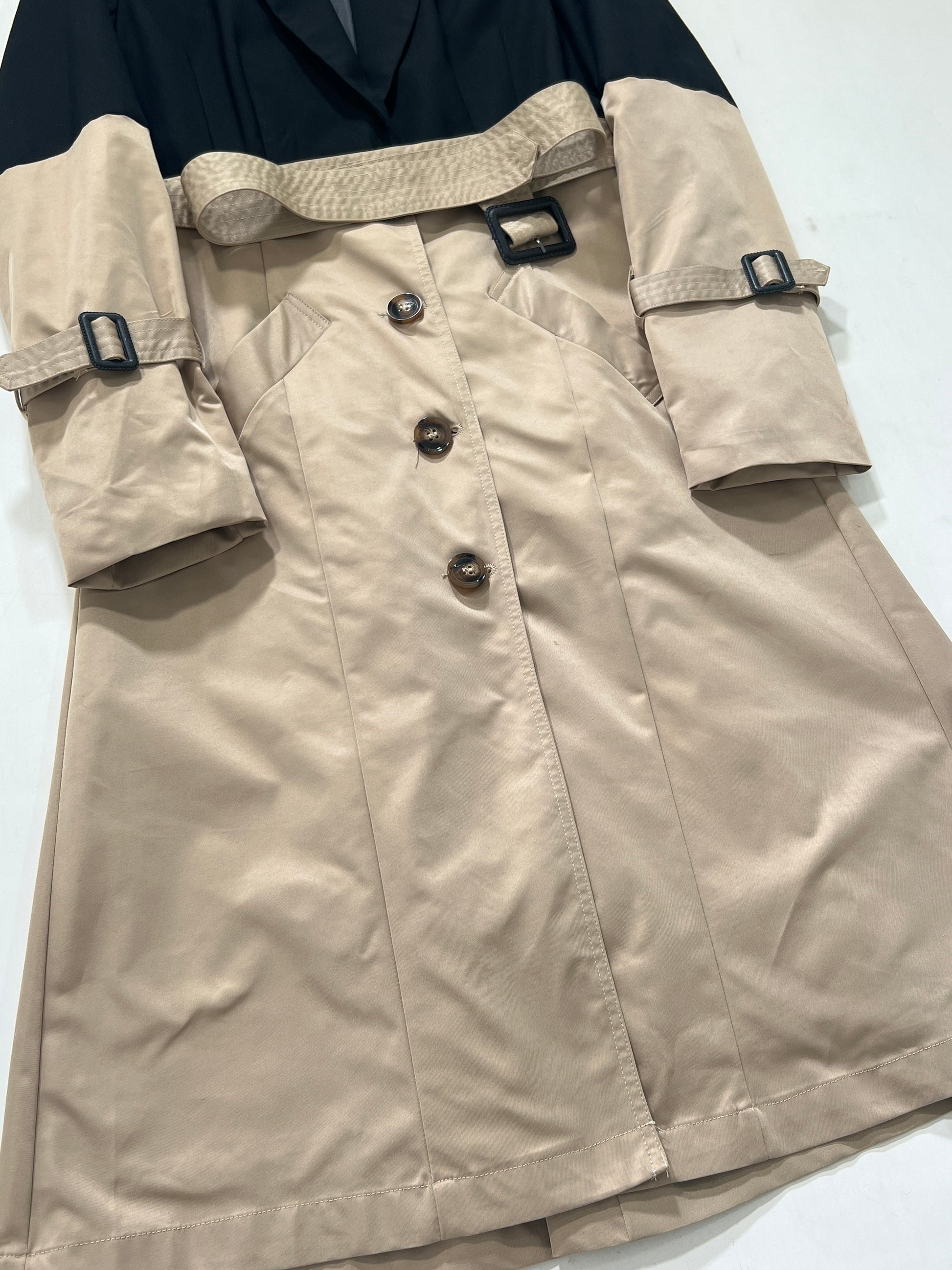 Trench vintage Burberry beige e nero con spalline, manica lunga, doppia tasca frontale, chiusura con bottoni e cintura.
