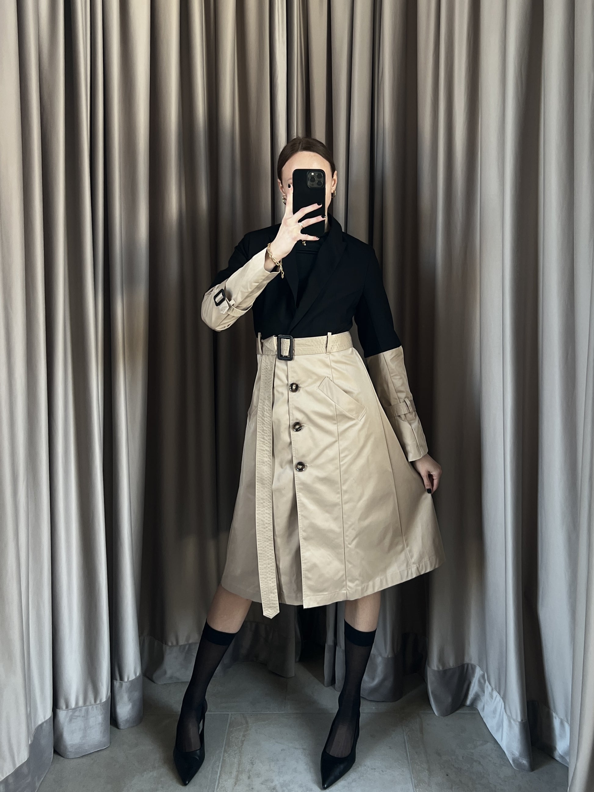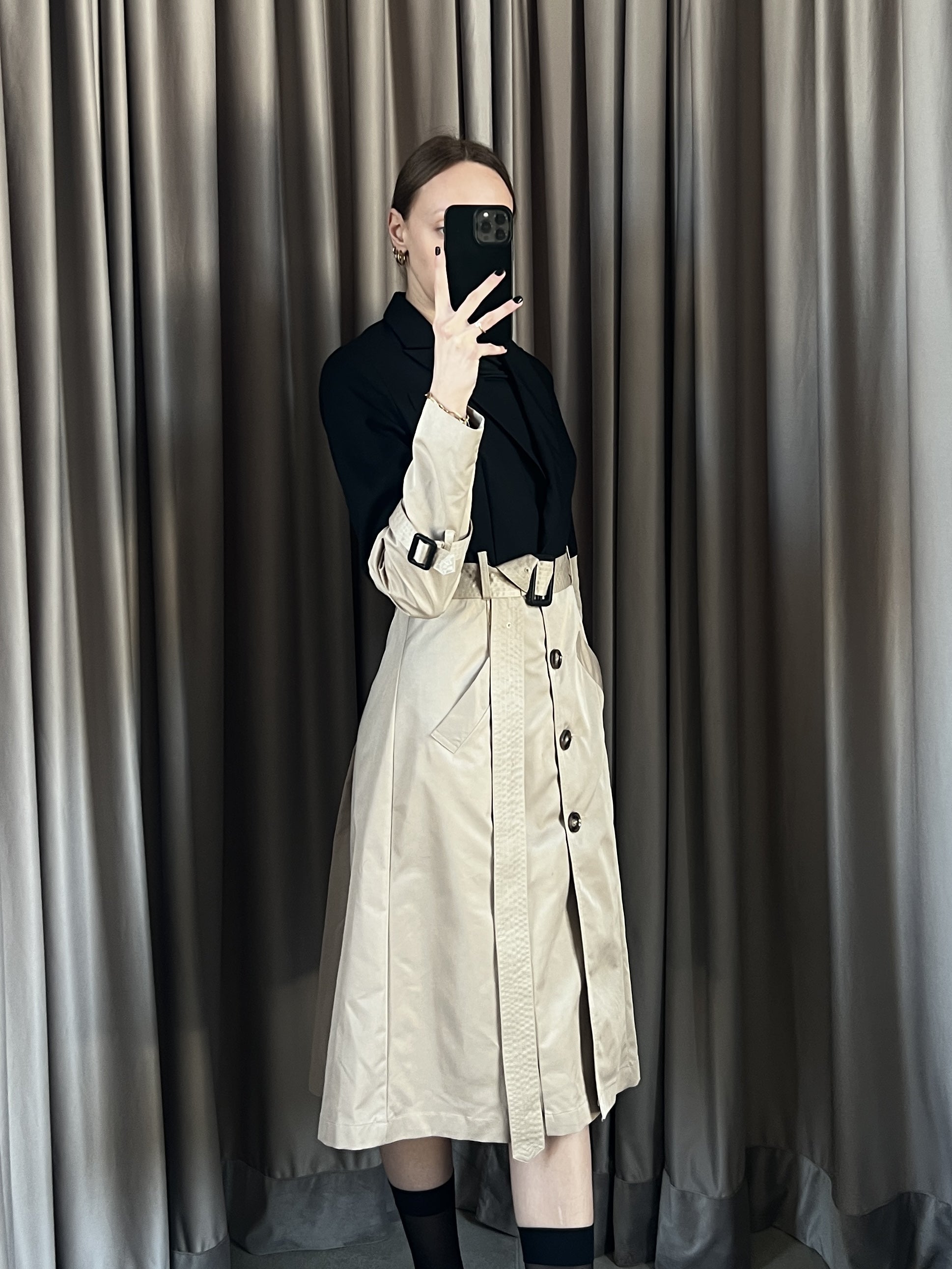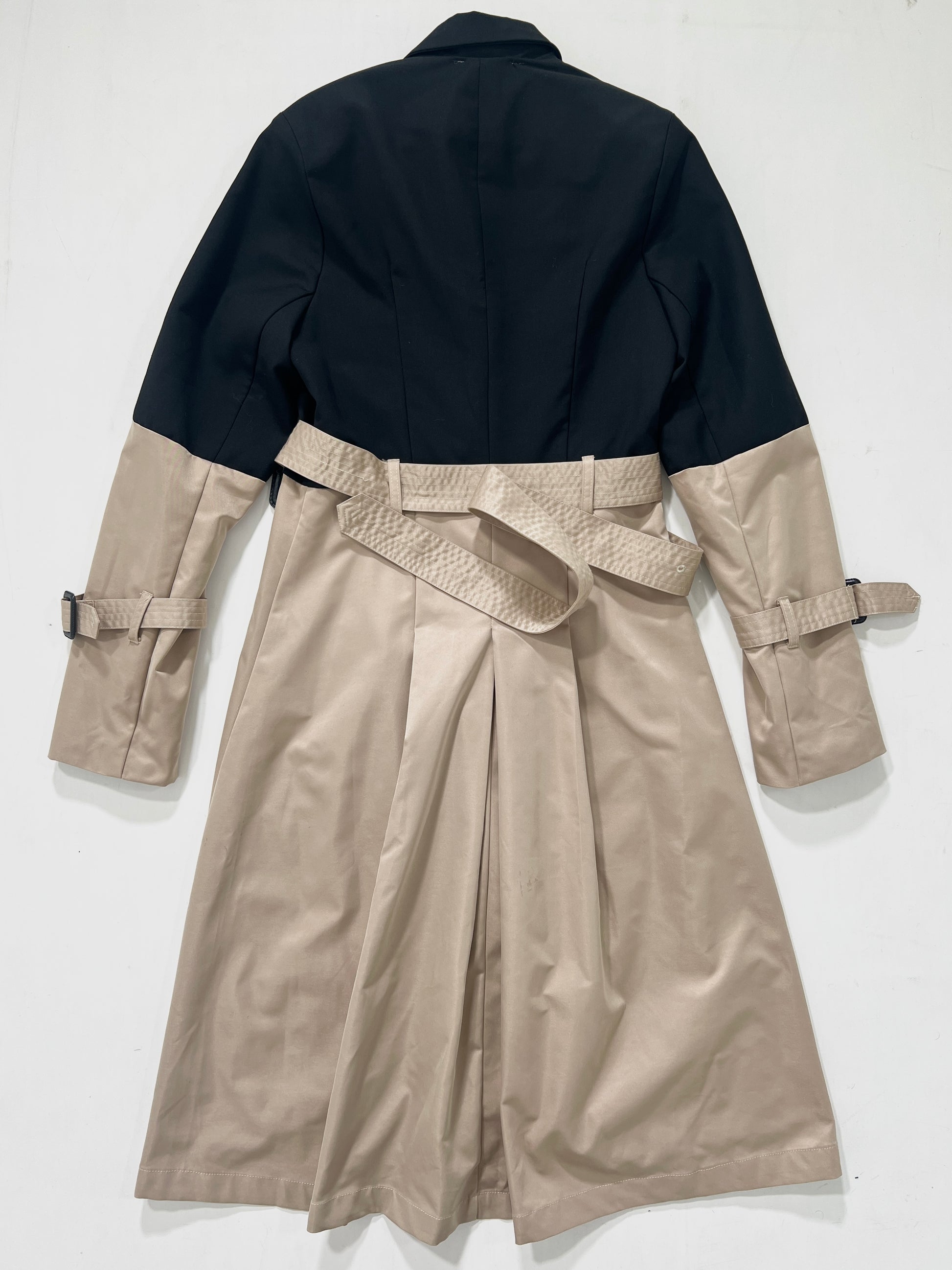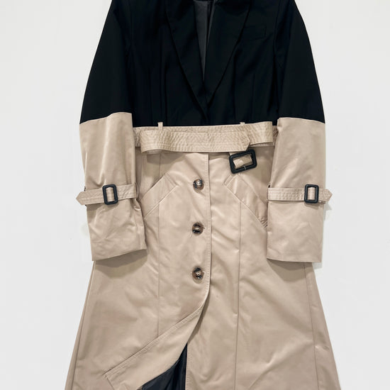 Trench vintage Burberry beige e nero con spalline, manica lunga, doppia tasca frontale, chiusura con bottoni e cintura.