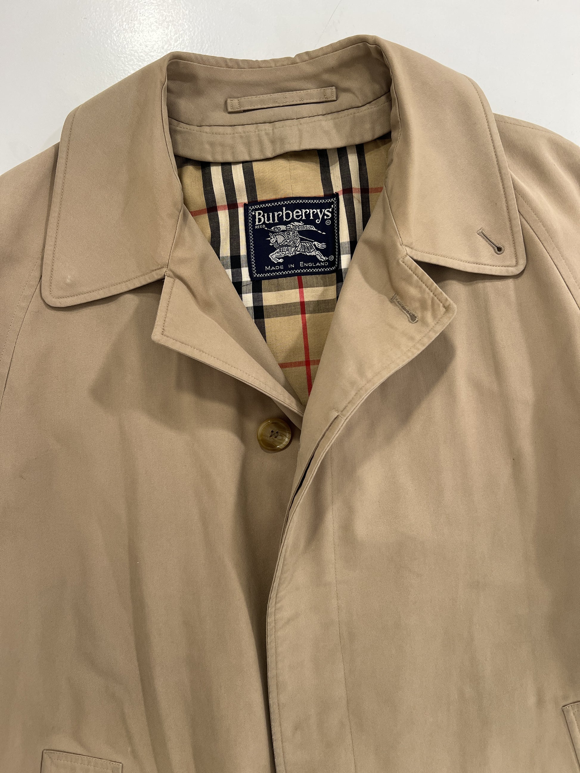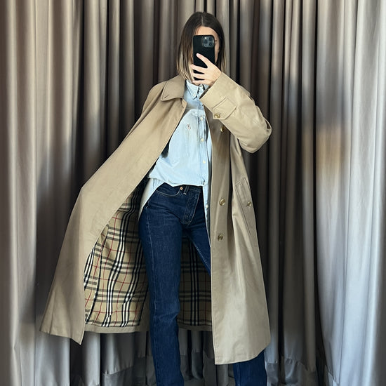 Trench vintage Burberry biscotto, manica lunga, doppia tasca frontale, chiusura con bottoni. Condizioni ottime, unisex.