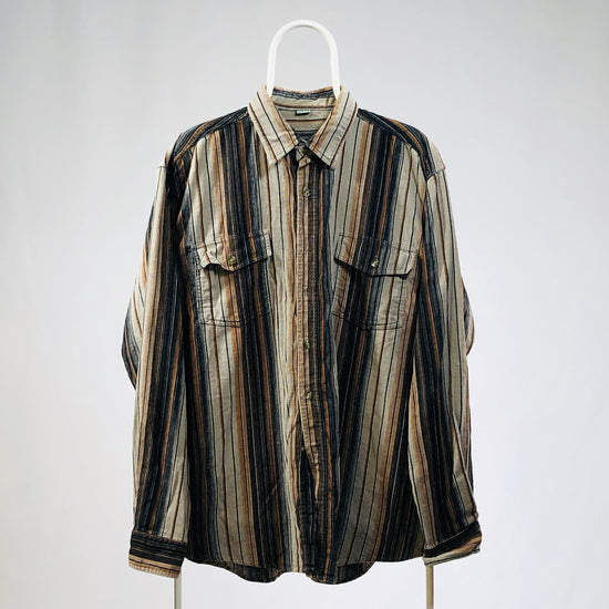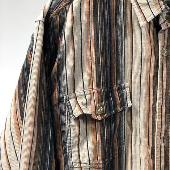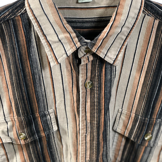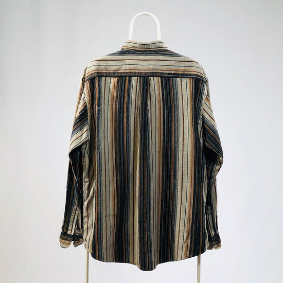 Camicia vintage in velluto, righe marroni e beige, tasche frontali, tg L, vestibilità regolare, manica lunga. Da indossare anche oversize.